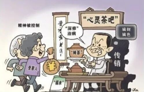 比如,“心灵茶吧”骗取钱财超1600万元。以考验忠实度、治疗疾病等借口奸淫妇女10名。劝受害人只喝“神茶”不吃药,致6人病情加重死亡,1人在培训后精神失常跳楼自杀身亡。