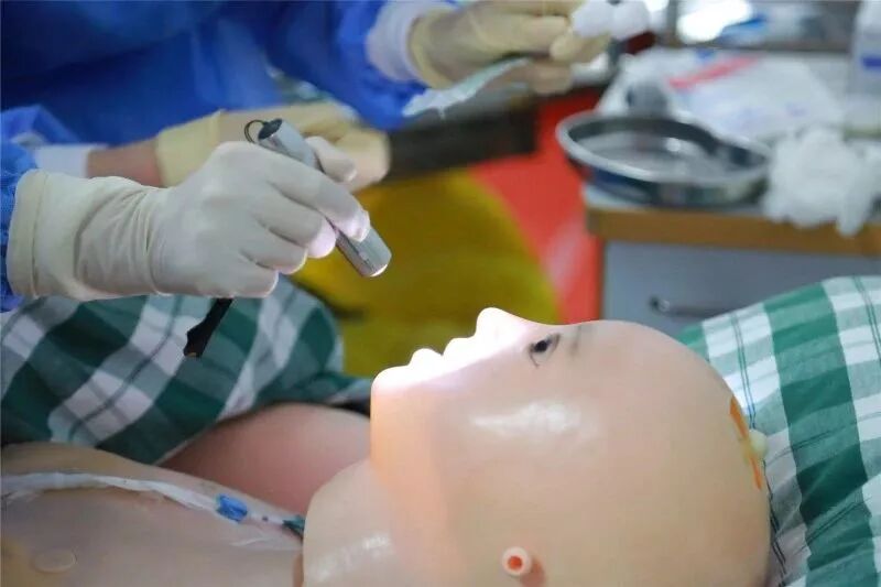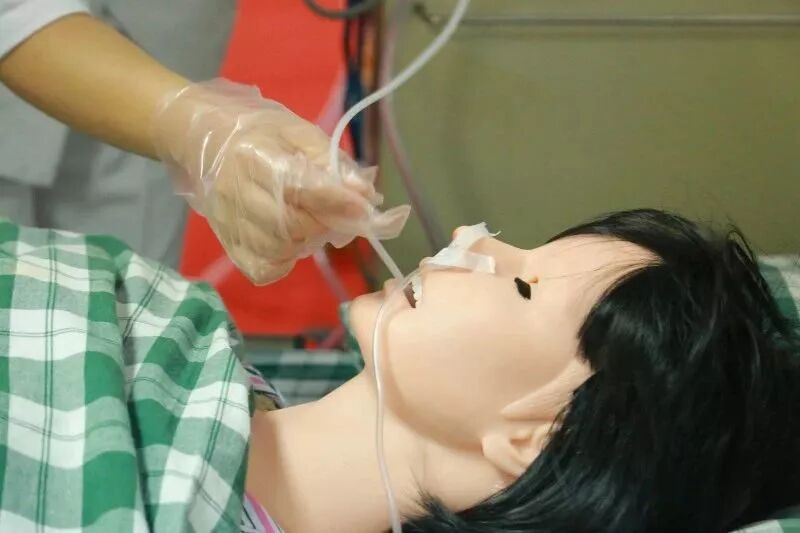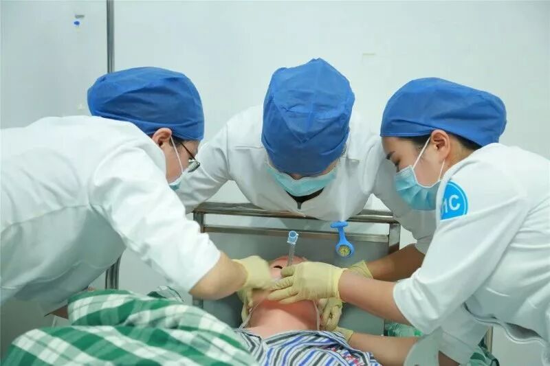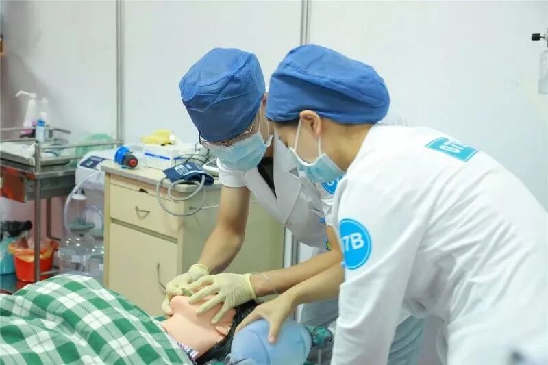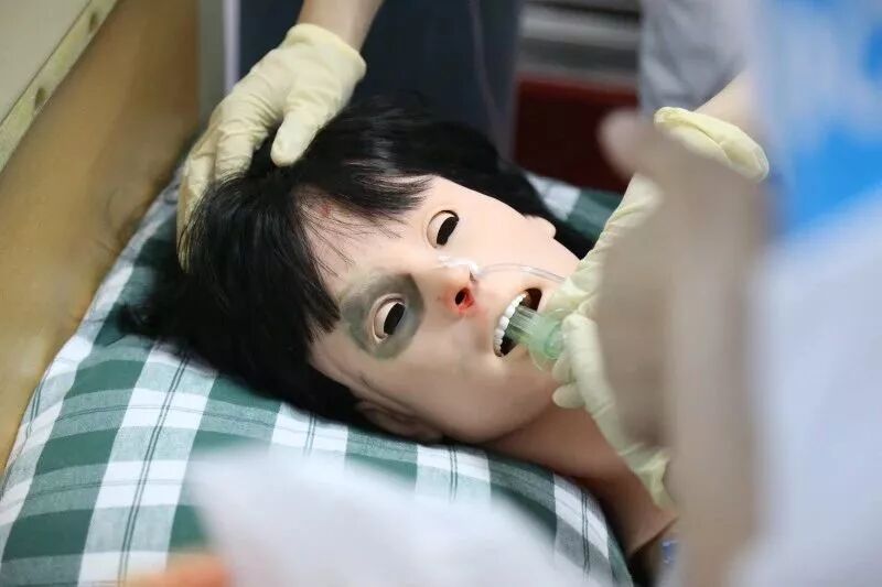 案例一为头部外伤引起的硬脑膜下出血并发肺部感染,共计有十个题干不断出现,需要根据题干信息结合模拟人客观体征和志愿者扮演的患者主诉,迅速判断患者出现何种神经系统和呼吸系统状况。你看,这三位选手快速各就各位,一会儿头碰头,一会儿又散开,他们手不停脚不停,小编的视线听力感觉根本跟不上他们的节奏。在题干信息提示鼾声呼吸,肺部痰鸣音明显,sp02下降至80%时,小编还在疑虑鼻孔外怎么有红色的东西时,我们的选手已经在经口吸痰了。在这个环节中最能显示选手气道管理的能力,看来我们的选手不仅能“运气”,还特别“气顺”啊!