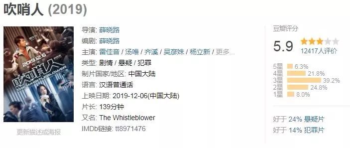 12月6日上映,顶着“华语电影第一部吹哨人题材影片”的《吹哨人》。