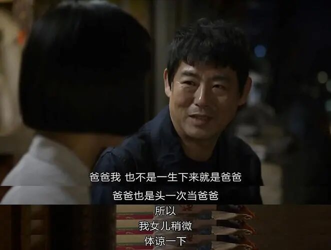 之后,爸爸买了生日蛋糕单独去安慰女儿,这个段落动人,不仅因为那句后来成为金句的“爸爸也是第一次当爸爸”的台词写得好,更因为情感把握的细腻准确。父亲和母亲对孩子的情感不一样,爸爸不会像妈妈那样自然亲昵,他有无法宣之于口的疲惫,更有对孩子的怜惜愧疚,在说那些充满爱意的话语时甚至不能直视女儿,这笨拙的表达才属于爸爸。