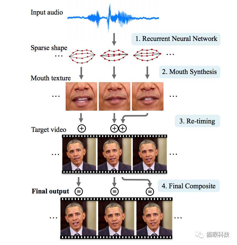 研究小组用一个深度学习神经网络来分析视频的数百万帧影像,以判断奥巴马在讲话时面部的变化,比如他的嘴唇、牙齿,甚至是嘴巴和下巴周围的皱纹。