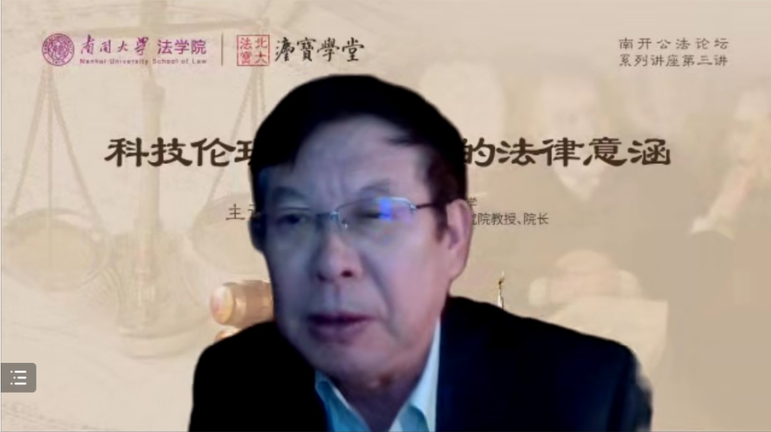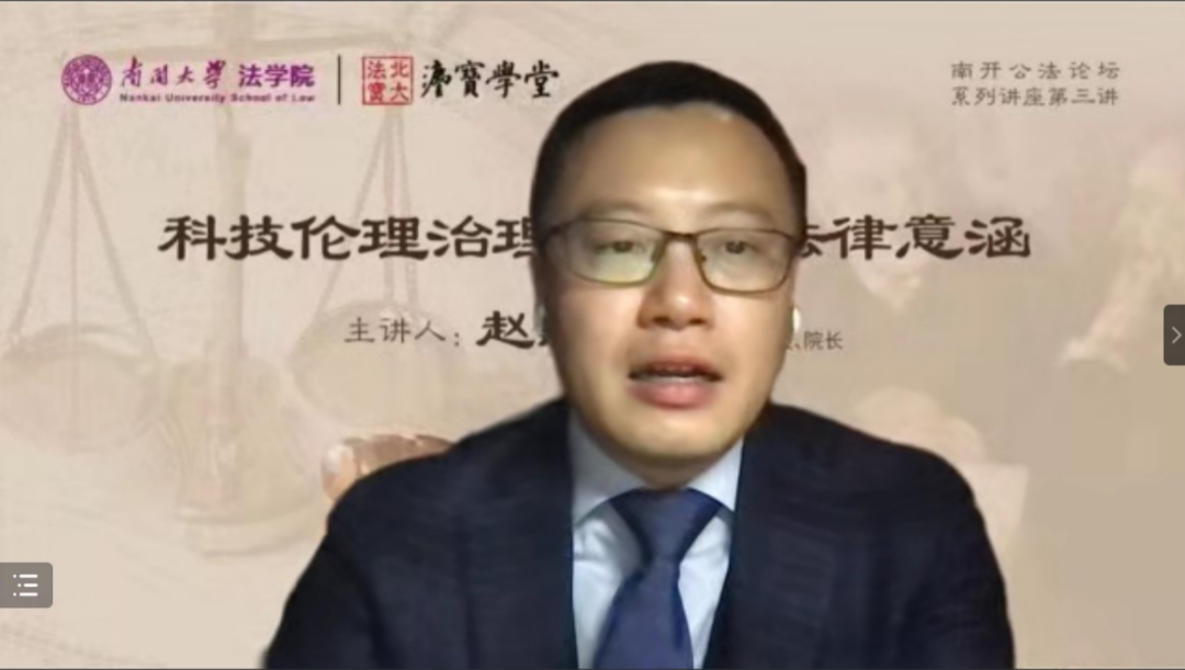 2022年12月15日晚,中国政法大学法治政府研究院院长赵鹏教授线上做客“南开公法论坛”,讲座题目为“科技伦理治理兴起的法律意涵”。本次讲座由南开大学法学院王瑞雪副教授主持,南开大学法学院付士成教授、南开大学法学院院长宋华琳教授、南开大学法学院副院长闫尔宝教授参会与谈。本次讲座是南开公法论坛系列讲座第三讲,由南开大学法学院宪法行政法教研室、国家社科基金重大项目“突发公共卫生事件防控的法治体系”课题组承办,北大法宝学堂提供技术支持,吸引两千一百余人次在线观看。