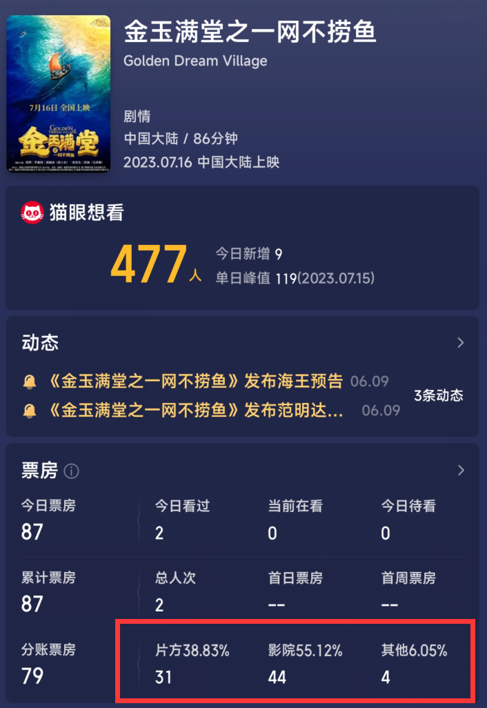 7月16号还有一部新片《金玉满堂之一网不捞鱼》首映,可惜上映首日就宣告扑街了。