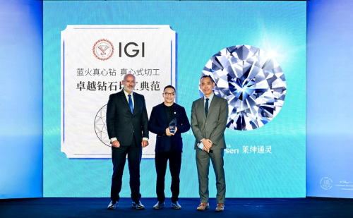 在这场备受瞩目的盛会上,莱绅通灵以其卓越的工艺和精湛的设计征服评委和观众们的眼球。蓝火真心钻系列凭借其独特的匠心传承,展示出莱绅通灵对珠宝艺术的深入理解和追求卓越的态度。代表作品“蓝火真心钻”,便是其设计和工艺的最佳体现:经钻石切割大师多年研发、上千次打磨而成,钻石底部以浪漫“心”形,展示了其行业独特的切工优势。因此受到获得比利时政府、中国政府、IGI(国际宝石研究院)和 NGTC(国家珠宝玉石质量监督检验中心)同时颁奖认证。