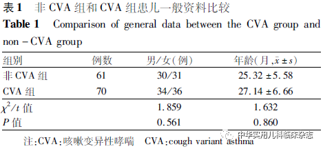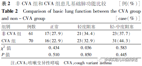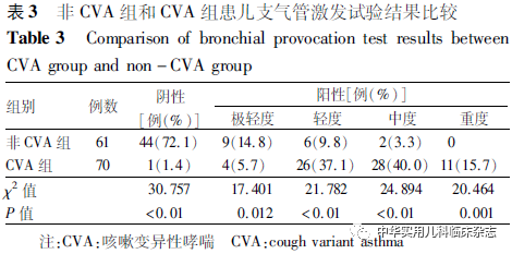 咳嗽变异性哮喘(cough variant asthma,CVA)是引起我国儿童慢性咳嗽的最常见原因,慢性咳嗽婴幼儿中最终诊断为CVA的比例约占30%[1-2]。研究显示,约1/3的CVA患儿在4~5年的随访中最终转为哮喘[3-4]。CVA的高发病率及其潜在的不良转归已引起广泛关注,尤其是婴幼儿慢性咳嗽人群中CVA应予以早期重视及干预。CVA与哮喘有共同的病理生理基础,即气道高反应性(AHR),通过测定气道反应性有助于CVA的诊断。临床上常通过支气管激发试验(bronchial provocation test,BPT)来检测AHR的存在和严重程度[5],但目前BPT多适用于成人及6岁以上儿童,婴幼儿因其配合能力有限而限制了其临床应用,从而影响了CVA的早期临床诊断。潮气呼吸肺功能检测无需患儿配合,能敏感地反映患儿气道阻塞性病变[6]。因此,本研究通过潮气肺功能检测结合BPT来测定婴幼儿CVA患儿的气道反应性,并与非CVA的慢性咳嗽患儿相比较,以期为CVA婴幼儿临床诊断提供依据。1资料与方法1.1 研究对象 选择2018年1月至2018年12月在重庆医科大学附属儿童医院哮喘专科门诊就诊并随后确诊的70例年龄1~3岁的CVA患儿作为研究对象(CVA组)。选择同时期在本院哮喘专科门诊就诊的61例年龄1~3岁的非CVA的慢性咳嗽患儿[包括呼吸道感染后咳嗽(PIC)36例、上气道咳嗽综合征(UACS)15例、气道异物6例、嗜酸性粒细胞性支气管炎4例]作为对照(非CVA组),回顾性分析所有患儿初次以“咳嗽>4周”为主诉就诊时的肺功能检测数据。 CVA、PIC、UACS的诊断标准均参照《中国儿童慢性咳嗽诊断与治疗指南(2013年修订)》[7];嗜酸性粒细胞性支气管炎的诊断参照《嗜酸性粒细胞性支气管炎的诊断与治疗》[8];气道异物的诊断依靠纤维支气管镜检查发现异物确诊。具体诊断标准如下:CVA组患儿诊断标准:(1)病程>4周的持续性干咳,常在夜间和/或清晨发作,运动、冷空气刺激后咳嗽加重;(2)临床无感染征象,胸部X线片无明显异常;(3)有变应性疾病家族史及个人过敏史,变应原检测至少有1种抗原呈现阳性反应;(4)后续支气管扩张剂试验性治疗有效。PIC患儿诊断标准:(1)持续咳嗽4~8周,为刺激性干咳或伴少许白色黏痰;(2)4~8周前有明确的呼吸道感染史;(3)胸部X线片无明显异常;(4)后续随访明确慢性咳嗽自愈。UACS患儿诊断标准:(1)持续咳嗽>4周,伴白色泡沫痰或黄绿色浓痰,晨起或体位变动时咳嗽加重;(2)胸部X线片无异常,鼻咽喉镜检查或头颈部侧位片、鼻窦X线片提示鼻炎或鼻窦炎;(3)咽喉壁滤泡增生,有时可见鹅卵石样改变,或见黏液样或脓性分泌物附着;(4)后续鼻炎或鼻窦炎针对性治疗有效。嗜酸性粒细胞性支气管炎患儿诊断标准:(1)持续咳嗽>4周,以刺激性干咳为主;(2)胸部X线片无异常;(3)吸入糖皮质激素试验性治疗有效;(4)纤维支气管镜检查支气管肺泡灌洗液中嗜酸性粒细胞比例>0.03。所有患儿的排除标准:(1)胸片有异常提示;(2)肺部体检有阳性体征,如鸡胸、漏斗胸等;(3)基础潮气肺功能检测显示限制性通气功能障碍;(4)基础潮气肺功能检测显示中度或重度阻塞性通气功能障碍;(5)受试前72 h内曾使用支气管扩张剂、平喘药物、糖皮质激素或抗过敏药物;(6)近4周内有呼吸道感染史。研究方案获得本院医学伦理委员会批准(批准文号:089/2013),并征得患儿监护人知情同意。1.2 方法 1.2.1 潮气肺功能测定 受检前给予患儿100 g/L水合氯醛(30~50 mg/kg)口服镇静,使患儿处于药物诱导的平稳睡眠状态。采用德国耶格公司生产的MasterScreenPaed肺功能仪进行潮气肺功能检测。检测方法严格参照《儿童肺功能系列指南(四):潮气呼吸肺功能》[9]的质控要求。检测前清除患儿鼻腔分泌物,同时监测患儿经皮血氧饱和度(SpO2)。基础潮气肺功能检测显示达峰时间比[(TPTEF/TE)%]和达峰容积比[(VPTEF/VE)%]2个指标中有1个数值超过23,同时SpO2≥95%者入组并进行气道反应性测定。2组入组患儿均符合以上条件。1.2.2 气道反应性测定 参考“肺功能检查指南-组织胺和乙酰甲胆碱支气管激发试验”中2 min潮气吸入法步骤[10],并结合文献调整激发剂浓度和时间[11-13]。患儿通过压缩式射流雾化机(Inhaler PRO,百瑞医疗)依次雾化吸入不同浓度的乙酰甲胆碱(MCH,Sigma,USA),浓度从0.5 mg/mL开始,每次加药量2 mL,雾化时间为1 min,30~60 s后重复进行潮气肺功能检测,检测过程中密切观察患儿SpO2、心率及肺部体征,间隔2 min后再依次吸入2 g/L、8 g/L、16 g/L的MCH,直至患儿出现BPT阳性或MCH浓度增至16 g/L,终止MCH的吸入。BPT阳性患儿在气道反应性测定终止后立即给予支气管扩张剂硫酸特布他林雾化液(博利康尼,AstraZeneca,瑞典)2.5 mg雾化吸入,30~60 s后重复检测肺功能。1.2.3 结果判定 BPT阳性结果以综合指标来判断[13]:(1)肺部出现呼气性哮鸣音;(2)(TPTEF/TE)%、(VPTEF/VE)% 2个指标中其中1个数值下降≥20%;(3)SpO2数值下降超过5%。在激发试验过程中如出现(1)或(2)、(3)同时出现视为激发阳性。患儿在给予0.5 g/L MCH后出现BPT阳性反应者,判定为重度阳性反应;在给予2 g/L、8 g/L、16 g/L的MCH后出现阳性反应者,依次判定为中度、轻度、极轻度阳性反应;在给予16 g/L的MCH后未出现阳性反应者,判定为阴性反应。1.2.4 BPT过程中的风险控制 BPT检测室配备氧气、支气管扩张剂、肾上腺素等急救用品,检测过程中密切观察患儿呼吸状况及SpO2数值,若患儿出现呼吸加深加快、剧烈咳嗽、喘息或SpO2数值明显下降等,及时终止激发剂的吸入并检测潮气肺功能,必要时给予氧气、支气管扩张剂吸入或