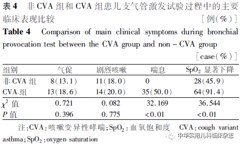 2.4 气道反应性测定试验过程中患儿的主要临床表现BPT过程中,CVA组患儿出现喘息及SpO2显著下降的比例高于非CVA组,差异均有统计学意义(均P<0.01),而出现气促及剧烈咳嗽的比例与非CVA组接近,差异均无统计学意义(均P>0.05)。结果见表4。