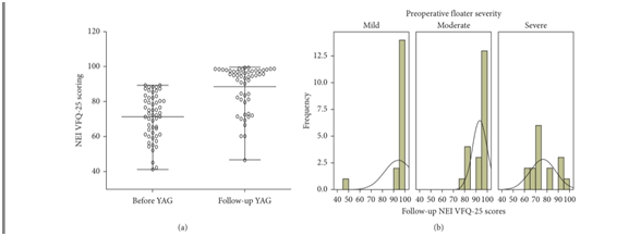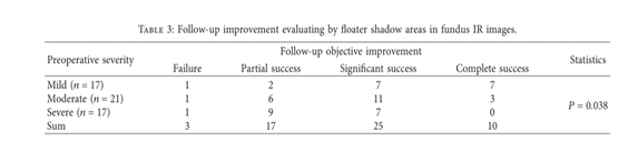 3.3. 主观视觉感受改善。每个患者在YAG玻璃体激光消融术术前及术后完成NEI VEQ-25问卷调查。平均评分为71.44±12.77,在6个月的随访中增加至88.54±12.74分(t=11.82,P=0.001)(图1(a))。与基线相比,6个月时患者的一般视力和周边视力明显改善。随访过程中,4眼治疗失败,1眼出现更严重的症状,3眼改善程度较小,20只眼部分改善,23只眼显著改善,8眼症状完全消失。我们对术前有轻度到重度的飞蚊症患者的VFQ-25的评分进行了随访,如图1(b)所示,术前有轻度或中度飞蚊症的患眼有较高的飞蚊分辨率和明显的改善,术前有严重飞蚊症的患眼有治疗失败或部分缓解的倾向。此外,如表2所示,根据术前混浊的严重程度,三组间YAG激光治疗的临床疗效有显著的差异(P=0.007)。