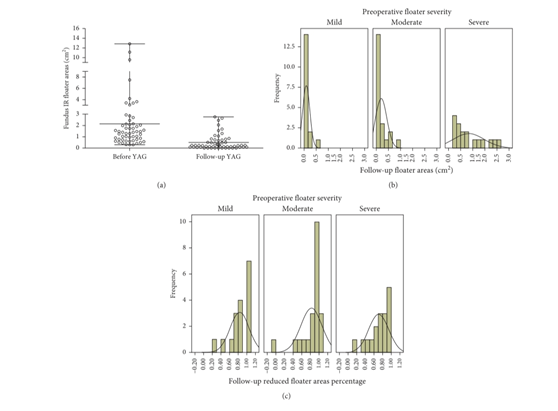 3.2. YAG治疗安全性。经YAG玻璃体激光消融术治疗的55眼平均接受209发激光治疗,YAG激光仪的平均手术时间为12.3分钟(10.3-16.5分钟),每只眼睛的平均总能量为708mj(范围188-1002mj)。38只眼只接受1次激光治疗,17眼在第1次激光治疗1周后再次进行治疗。术中未出现明显的与YAG激光消融术相关的并发症,如视网膜脱离、眼底出血等病理改变,但有1只伴有严重飞蚊症和PVD的患者出现视网膜轻度出血,予以糖皮质激素、眼部神经营养物质和维生素C治疗2周,随后病情好转。随访时的平均眼压为15.34±3.27mmHg,与基线相比无明显变化(P=0.23)。随访时视力也无明显变化。
