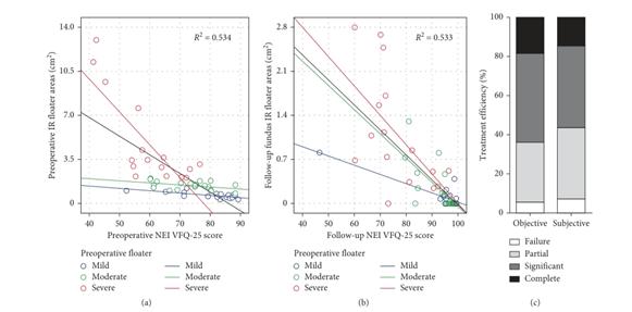 3.5. VFQ-25问卷评分与混浊物之间的相关性。为确定主观和客观数据的一致性,我们使用皮尔森相关系数分析来判断VFQ-25评分与混浊物之间的相关性。结果显示,混浊物面积与VFQ-25评分在YAG激光术前(r=-0.73,P=0.001)和术后(r=-0.72,P=0.001)呈负相关(图3(a)和3(b)),客观疗效与主观疗效差异无统计学意义(P=0.877)(图3(c))。
