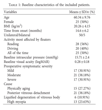 3.1. 基线特征。共55只眼,50名合格受试者(25名女性/25名男性,平均年龄60.34±9.76岁)患有飞蚊症且完成6个月随访者最终纳入本研究。患者主诉在行YAG玻璃体激光消融术前的平均14.6±6.2个月就开始受到飞蚊症的干扰,28例(56%)患者主诉飞蚊症影响了其阅读活动,20例(40%)患者主诉在驾驶时受到飞蚊症干扰,有一半的患者抱怨飞蚊症的干扰是一直存在的。根据患者的生活受影响程度及红外眼底成像的严重程度进行了评估,17眼(30.91%)为重度,21眼(38.18%)为中度,其余17眼(30.91%)为轻度。老化、PVD、高度近视是造成飞蚊症的主要原因。术前眼压为15.71±2.4mmHg,所有研究对象的眼压均在正常值范围内(表1)。
