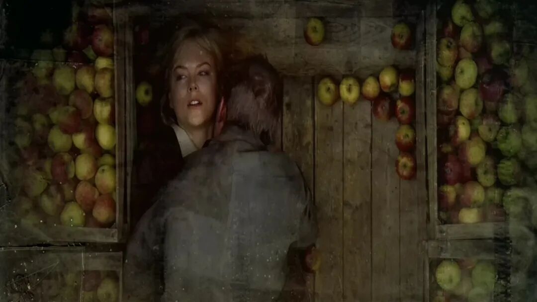 电影《狗镇》剧照但好景不长,转折点发生在独立日庆贺当天,警察贴的失踪者告示换成了通缉令告示,人们的态度发生了微妙的变化,开始对她另眼相看,变本加厉地延长她的工作时间,减少她的工资,被认作是对危险成本的补偿。人善被人欺,男人趁机强暴她,而她却一再容忍,站在道德制高点上选择无底线的原谅和宽恕。镇民却越发暴力,女人恐吓她,连小孩子都欺诈她,最后她忍无可忍,试图逃离,结果又被带回小镇,这一次被镇民审判为盗窃罪而被套上锁链彻底变成了一条狗,沦为免费使用的劳动力和性奴隶,受尽非人虐待,甚至她爱的人都背叛了她。
