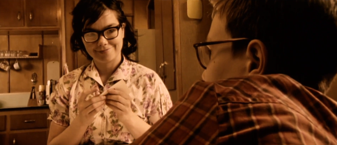 电影《黑暗中的舞者》剧照《狗镇》则完全抛弃了Dogma95规则,而使用了极简的舞台化风格,将文学、哲学、戏剧和电影融为一体,采取章节结构,旁白叙事,俯瞰人类的上帝视角,演员无实物表演,白线画的虚拟小狗,四季流转、飞絮白雪以及日月光线的变化渲染了情绪,具有高度的假定性和先锋的实验性,朴素别致,令人耳目一新,唯一保留下来的拉式风格依然是手持摄影的晃动镜头,它带来一种灵动自由的游移和探索感。