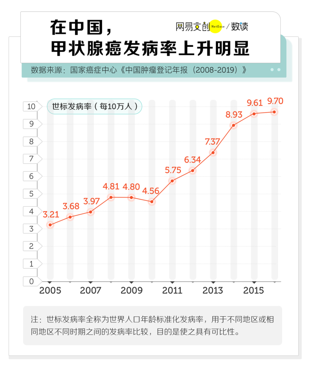 世标发病率是年龄标化后、排除了老龄化影响的数据,便于和不同地区、不同时期进行比较。2005 年以来,中国甲状腺癌的世标发病率由每 10 万人 3.21 上升至 2016 年的每 10 万人 9.7,翻了两倍有余 [6]。
