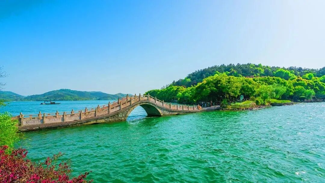 这里是天目湖湿地公园的姊妹亭,玉带桥,美似西湖东湖,它的总面积达11.5平方公里。