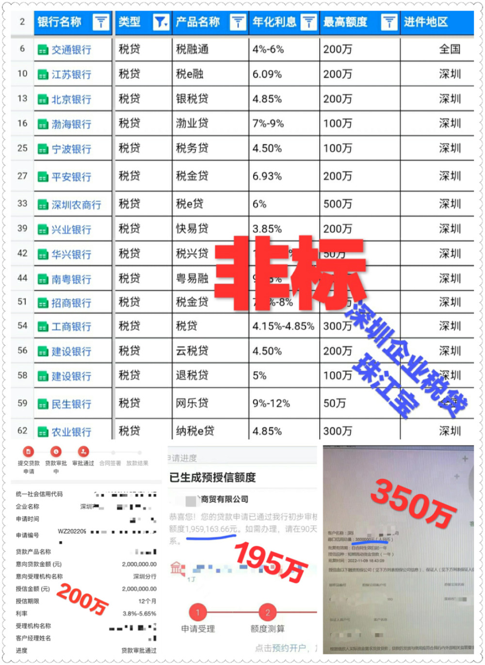 为了助力深圳小微企业、个体工商户持续稳定发展,慕容清月梳理了33款深圳小微企业银行税贷,支持小微企业、个体工商户扩大生产经营。企业主最关心的首要问题是额度批多少,其次才是利息。如果深圳小微企业纳税额和开票额低,只要纳税等级AB级,企业信用贷负债不超过500万,纳税额够足2万以上,就可以融资200-500万,200起。银行企业税贷按标准申请,可以获批额度最多按近一年纳税额的4-8倍授信,比如2022年一年纳税额是3万,征信没问题前提下,最多就能贷12-25万左右,而办理非|标企业税贷就是200W起。下文珠江宝介绍下深圳企业可以办理的企业贷。