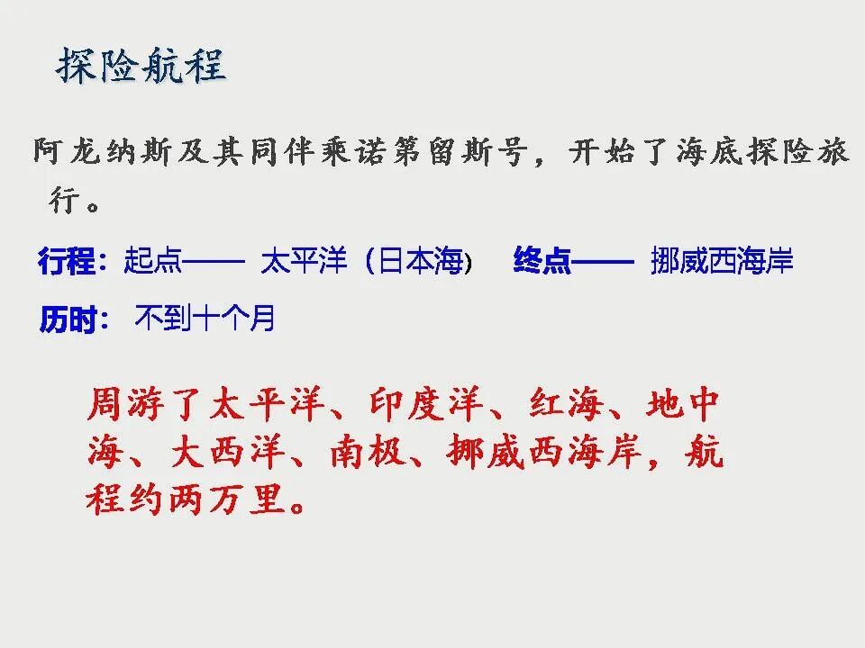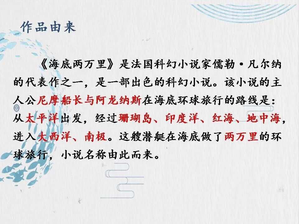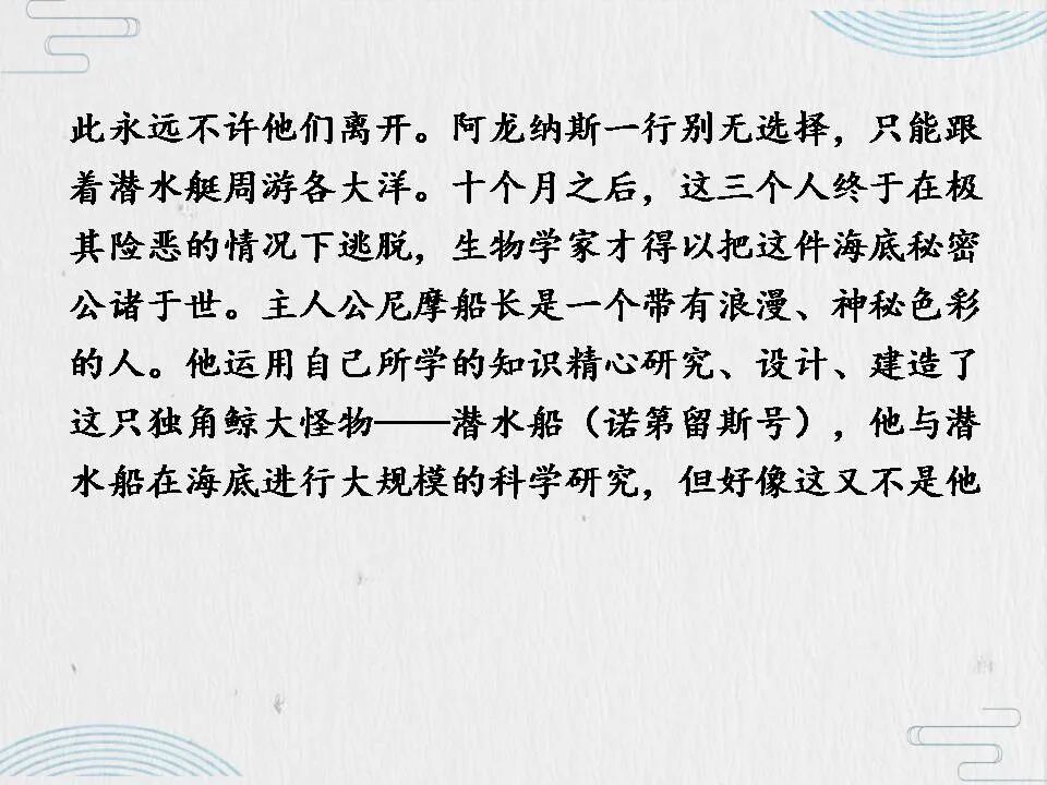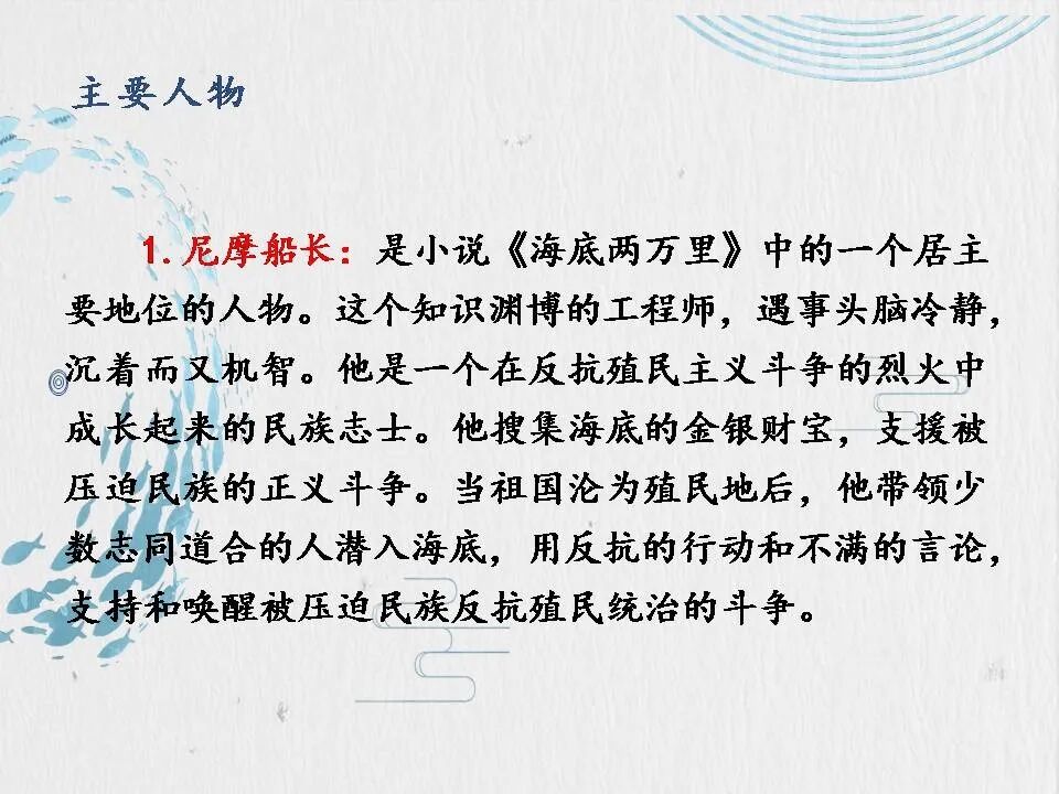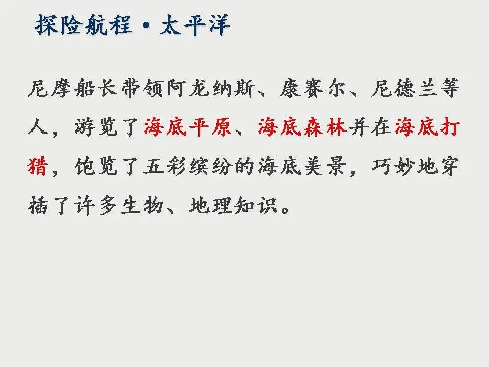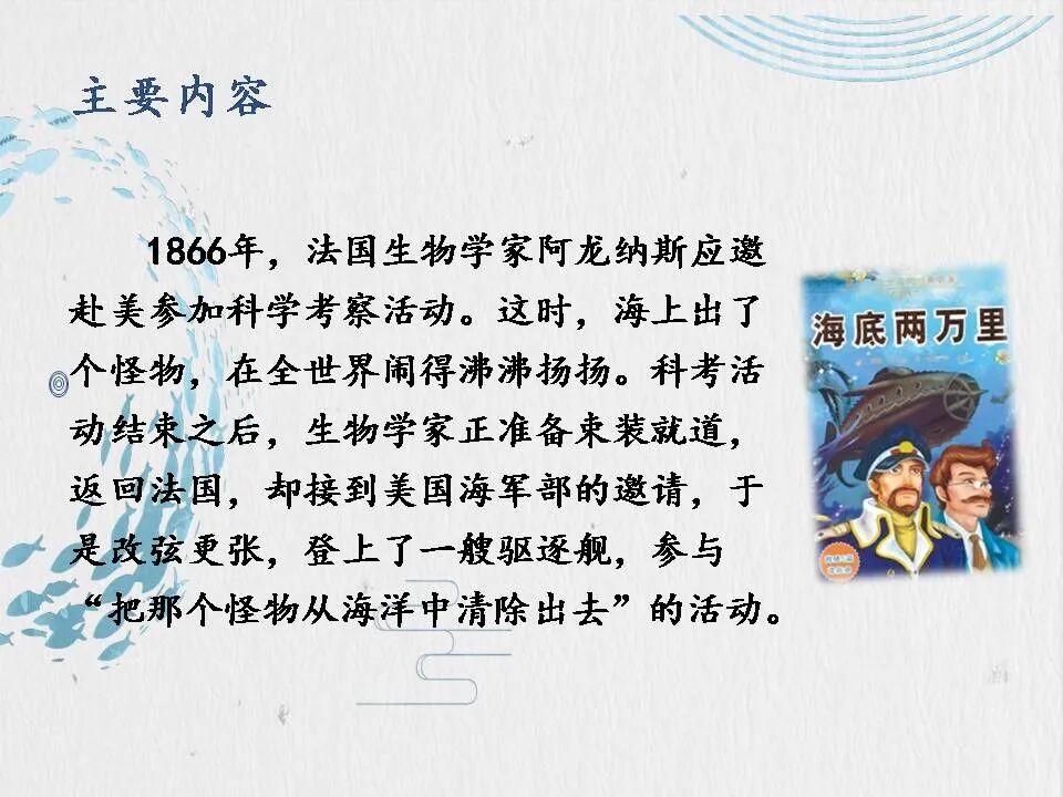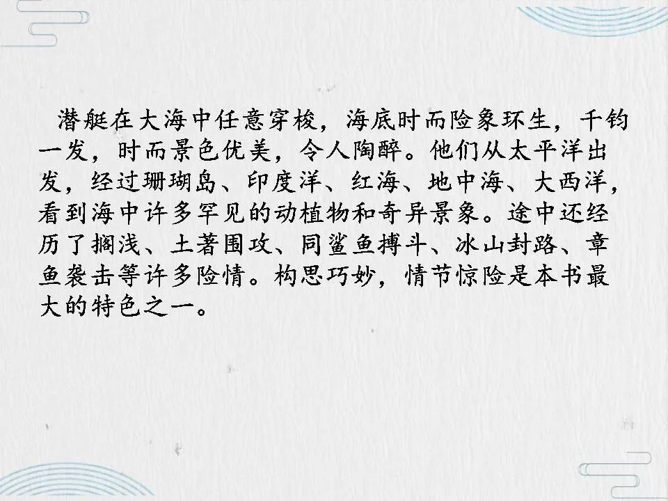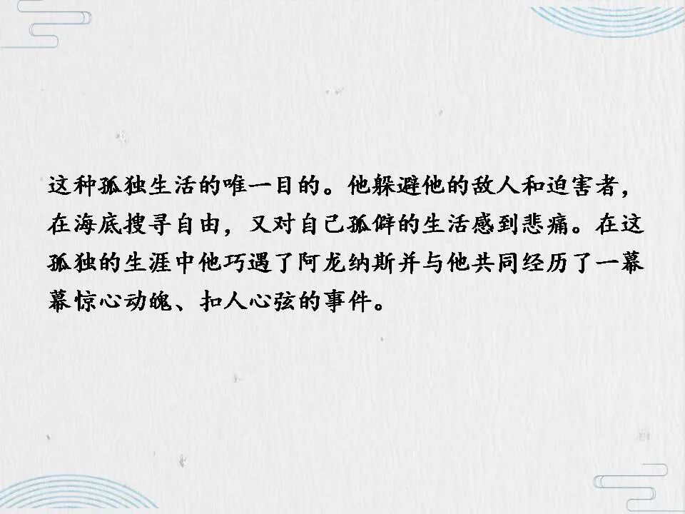 主要讲述了1866年法国生物学家阿龙纳斯带着仆人康塞尔和一个捕鲸手尼德?兰乘坐尼摩船长的诺第留斯号潜艇,在海底作了两万里的环球探险旅行。作者简介儒勒·凡尔纳:19世纪法国著名作家。生于海港城市南特,自幼喜欢航海,曾擅自离家做水手。1848年到巴黎学习法律,毕业后却去了剧院做秘书,写剧本,并热衷于各种科学的新发现。1863年,因出版《气球上的五星期》而一举成名,从此开始职业创作。他一生写有60多部科幻小说,大部分作品收录于总题为《在已知和未知的世界中的奇异漫游》的作品集。其中《格兰特船长的儿女》《海底两万里》和《神秘岛》被称为“凡尔纳三部曲”。他的作品对科幻文学流派有着重要的影响,他也因此被誉为“现代科学幻想小说之父”。主要内容《海底两万里》讲述了1866年,海上发现了一只疑似为独角鲸的大怪物,阿龙纳斯教授及仆人康塞尔受邀参加追捕。在追捕过程中,他们与鱼叉手尼德·兰不幸落水,到了怪物的脊背上。他们发现这怪物并非是什么独角鲸,而是一艘构造奇妙的潜艇。潜艇是尼摩在大洋中的一座荒岛上秘密建造的,船身坚固,利用海水发电。尼摩船长邀请阿龙纳斯作海底旅行。他们从太平洋出发,经过珊瑚岛、印度洋、红海、地中海、大西洋,看到海中许多罕见的动植物和奇异景象。途中还经历了搁浅、土著围攻、同鲨鱼搏斗、冰山封路、章鱼袭击等许多险情。最后,当潜艇到达挪威海岸时,三人不辞而别,回到了他的家乡。人物形象尼摩船长:这是一个带有人文主义和民主思想的典型的人物形象。在当时的历史条件下,他代表着新兴的资产阶级的利益。透过他的个性,可以看到处在上升阶段的资产阶级的代表人物那种自强不息的进取精神。他如大海一般兼具热情、冷酷、和善、危险、温和、暴躁、任性等性格特征。他是一个在反抗殖民主义斗争的烈火中成长起来的民族志士。他所渴望的不是金钱和财富,而是人生的自由和幸福。 阿龙纳斯教授:生物学家,博古通今,乘潜艇在水下航行,使他饱览了海洋里的各种动植物;他和他那位对分类学入了迷的仆人康塞尔,将这些海洋生物向我们做了详实的介绍,界、门、纲、目、科、属、种,说得井井有条,使读者认识了许多海洋生物;阿龙纳斯还把在海洋中见到的种种奇观,娓娓道来,令读者大开眼界。康赛尔:阿龙纳斯教授的仆人,生性沉稳,他从不大惊小怪。总是那么气定神闲,为人随和,从不着急上火——至少你看不出他着急上火。他精通分类理论,遇到什么总是认认真真或者说一本正经地把它们分类。尼德·兰:一个引人发笑的小人物。他勇敢、直爽,遇事鲁莽急躁。虽然因为贪吃惹出过不少麻烦,却能在关键时刻显示出不凡的身手。 艺术特色1.构思巧妙,情节惊险。 2.科学与幻想巧妙结合。3.场面描绘与细节刻画交替出现。4.人物具有社会正义感和崇高的人道主义精神一、飞逝的巨礁:1866年起,出现了一件大怪事。海洋中发现一个庞然大物,就像飞逝的巨礁,多艘航船莫名其妙的被撞裂了。公众坚决要求把着头怪物从海洋里清除掉。二、赞成与反对:对怪物主要有两派看法,一派认为是一种力大无穷的怪物,另一派则认为是一艘动力强大的“海下船”。我(法国巴黎自然史博物馆教授阿罗纳克斯)认为,怪物是一种力量大得惊人的“独角鲸”。美国海军部组织了一艘名为亚伯拉罕.林肯号的快速驱逐舰,准备去清除“怪物”。我应邀随行。 三、随先生尊便:我的仆人孔塞伊不假思索的说:“随先生尊便。”跟我一同上了以法拉格特为舰长的驱逐舰。驱逐舰从布鲁克林码头扬帆起锚,向大西洋全速前进。四、内德.兰德:舰长和全体海员同仇敌忾,决心一定要捕获独角鲸。只有加拿大人捕鲸手内德.兰德对独角鲸的存在表示怀疑。 五、向冒险迎去:舰只在太平洋上游弋。大家的眼睛睁得大大的,努力地观察海面。三个月过去了,海员们开始泄气了,开始怀疑自己这次搜寻行动的意义。半年后,海员们要求返航。舰长许诺最后搜寻三天,三天后如果还无结果就将回去。到了规定期限的最后时刻,一向无动于衷的内德.兰德突然喊叫起来,他发现了怪物。 六、全速前进:林肯号企图捕获独角鲸,而独角鲸却若无其事地同林肯号捉迷藏。经过一夜一天的追逐周旋,到第二天晚上,双方形成对峙。当林肯号向独角鲸发起进攻时,独角鲸却突然熄灭电光,向林肯号喷射大水。林肯号遭遇了灭顶之灾。七、不知其种属的鲸鱼:我被抛入海里,与孔塞伊在海中相依为命。正当筋疲力尽就要沉入海底时,被躲在独角鲸背上的内德.兰德拉出水面。内德说,这怪物不是鲸,是钢制的。我这才断定它是一艘潜水艇。我们在艇顶苟延残喘。天亮时,艇盖掀开,八个壮汉出来,把我们拖进艇里去。八、动中之动:我们三人被关进一间黑屋子。半小时后,突然眼前一亮,进来两个人。我们用法语、英语、德语和拉丁文进行自我介绍,对方均无反应。他们走了,侍者送来食物,我们饱餐后就进入了梦乡。九、内德.兰德的怒火:潜水艇浮出海面更换新鲜的空气。三人仍被关在铁屋子里,内德怒气冲天,他想逃跑,又想夺取这条艇。一个侍者进来时被他出其不意地打倒在地掐得半死。这时候,一个说法语的人出现了。十、海洋人:讲法语的就是这艘鹦鹉螺号潜水艇上的尼摩(意为“不存在的人”)艇长。他说第一次见面保持沉默