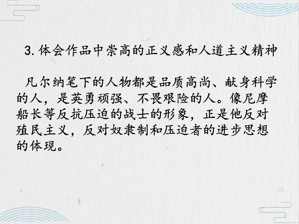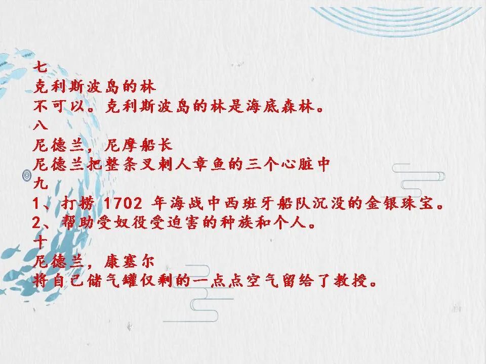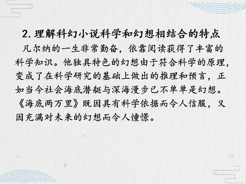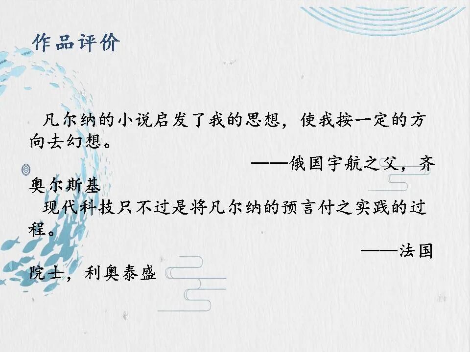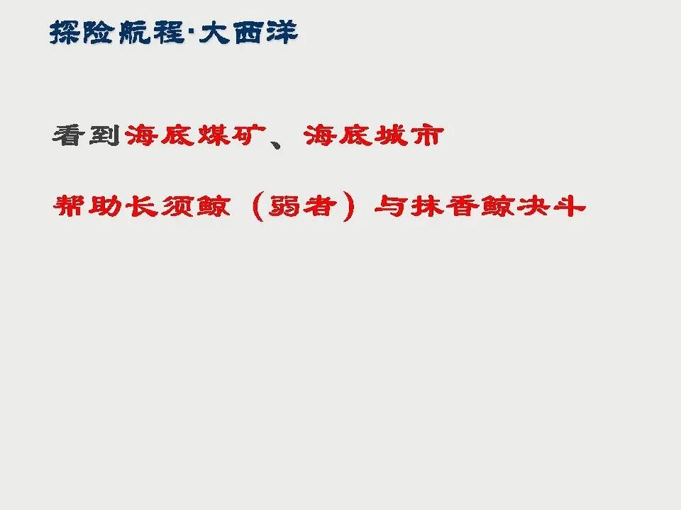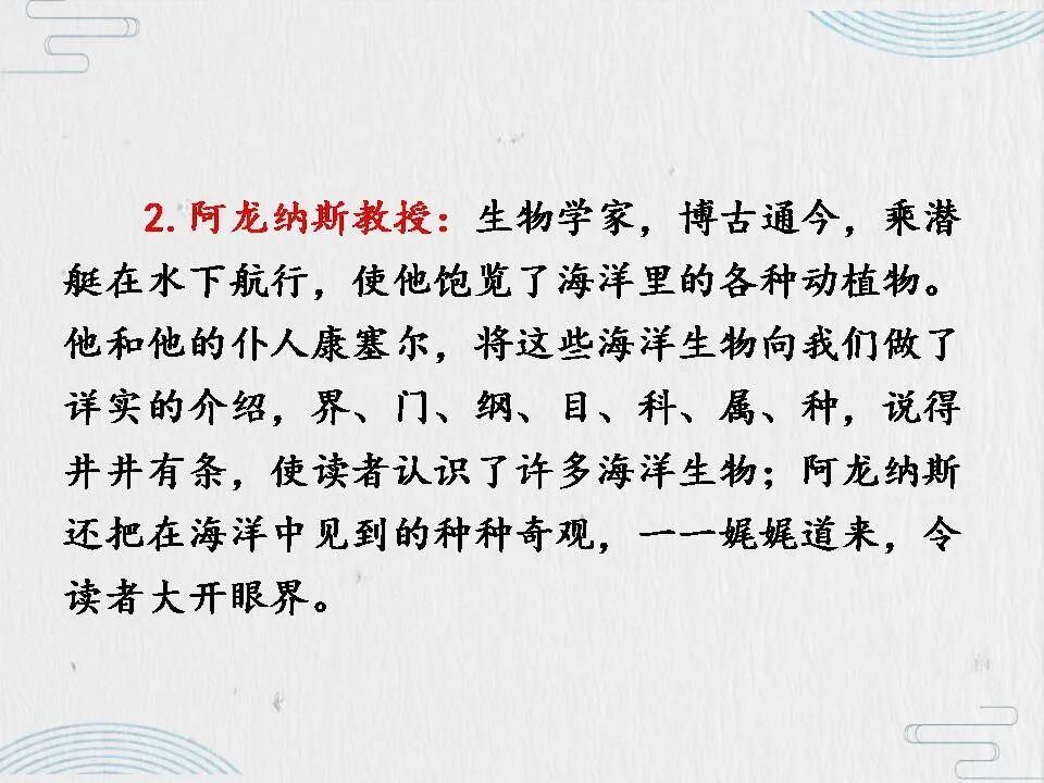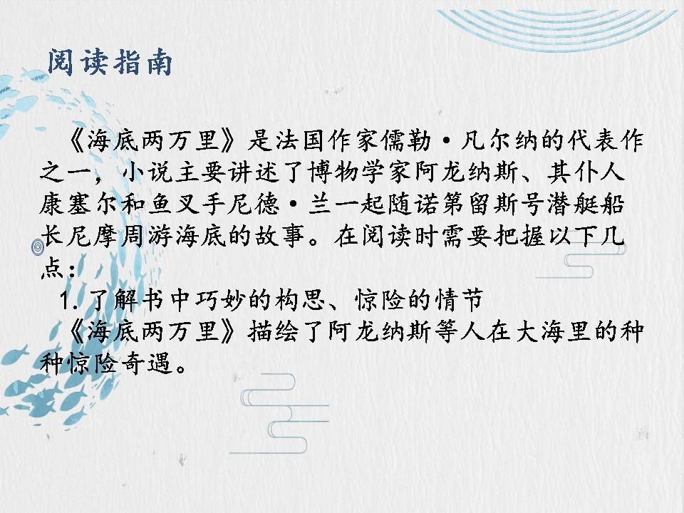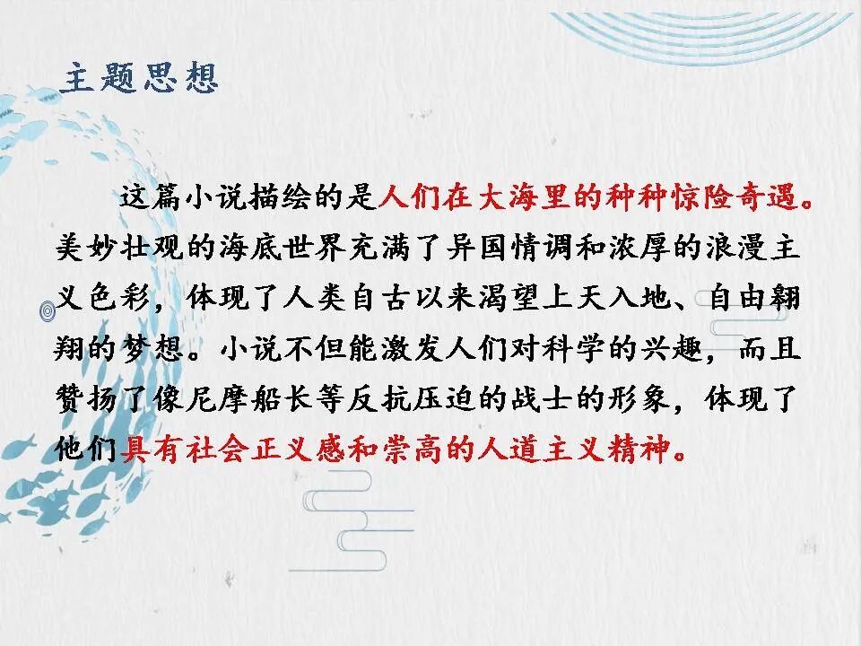 主要讲述了1866年法国生物学家阿龙纳斯带着仆人康塞尔和一个捕鲸手尼德?兰乘坐尼摩船长的诺第留斯号潜艇,在海底作了两万里的环球探险旅行。作者简介儒勒·凡尔纳:19世纪法国著名作家。生于海港城市南特,自幼喜欢航海,曾擅自离家做水手。1848年到巴黎学习法律,毕业后却去了剧院做秘书,写剧本,并热衷于各种科学的新发现。1863年,因出版《气球上的五星期》而一举成名,从此开始职业创作。他一生写有60多部科幻小说,大部分作品收录于总题为《在已知和未知的世界中的奇异漫游》的作品集。其中《格兰特船长的儿女》《海底两万里》和《神秘岛》被称为“凡尔纳三部曲”。他的作品对科幻文学流派有着重要的影响,他也因此被誉为“现代科学幻想小说之父”。主要内容《海底两万里》讲述了1866年,海上发现了一只疑似为独角鲸的大怪物,阿龙纳斯教授及仆人康塞尔受邀参加追捕。在追捕过程中,他们与鱼叉手尼德·兰不幸落水,到了怪物的脊背上。他们发现这怪物并非是什么独角鲸,而是一艘构造奇妙的潜艇。潜艇是尼摩在大洋中的一座荒岛上秘密建造的,船身坚固,利用海水发电。尼摩船长邀请阿龙纳斯作海底旅行。他们从太平洋出发,经过珊瑚岛、印度洋、红海、地中海、大西洋,看到海中许多罕见的动植物和奇异景象。途中还经历了搁浅、土著围攻、同鲨鱼搏斗、冰山封路、章鱼袭击等许多险情。最后,当潜艇到达挪威海岸时,三人不辞而别,回到了他的家乡。人物形象尼摩船长:这是一个带有人文主义和民主思想的典型的人物形象。在当时的历史条件下,他代表着新兴的资产阶级的利益。透过他的个性,可以看到处在上升阶段的资产阶级的代表人物那种自强不息的进取精神。他如大海一般兼具热情、冷酷、和善、危险、温和、暴躁、任性等性格特征。他是一个在反抗殖民主义斗争的烈火中成长起来的民族志士。他所渴望的不是金钱和财富,而是人生的自由和幸福。 阿龙纳斯教授:生物学家,博古通今,乘潜艇在水下航行,使他饱览了海洋里的各种动植物;他和他那位对分类学入了迷的仆人康塞尔,将这些海洋生物向我们做了详实的介绍,界、门、纲、目、科、属、种,说得井井有条,使读者认识了许多海洋生物;阿龙纳斯还把在海洋中见到的种种奇观,娓娓道来,令读者大开眼界。康赛尔:阿龙纳斯教授的仆人,生性沉稳,他从不大惊小怪。总是那么气定神闲,为人随和,从不着急上火——至少你看不出他着急上火。他精通分类理论,遇到什么总是认认真真或者说一本正经地把它们分类。尼德·兰:一个引人发笑的小人物。他勇敢、直爽,遇事鲁莽急躁。虽然因为贪吃惹出过不少麻烦,却能在关键时刻显示出不凡的身手。 艺术特色1.构思巧妙,情节惊险。 2.科学与幻想巧妙结合。3.场面描绘与细节刻画交替出现。4.人物具有社会正义感和崇高的人道主义精神一、飞逝的巨礁:1866年起,出现了一件大怪事。海洋中发现一个庞然大物,就像飞逝的巨礁,多艘航船莫名其妙的被撞裂了。公众坚决要求把着头怪物从海洋里清除掉。二、赞成与反对:对怪物主要有两派看法,一派认为是一种力大无穷的怪物,另一派则认为是一艘动力强大的“海下船”。我(法国巴黎自然史博物馆教授阿罗纳克斯)认为,怪物是一种力量大得惊人的“独角鲸”。美国海军部组织了一艘名为亚伯拉罕.林肯号的快速驱逐舰,准备去清除“怪物”。我应邀随行。 三、随先生尊便:我的仆人孔塞伊不假思索的说:“随先生尊便。”跟我一同上了以法拉格特为舰长的驱逐舰。驱逐舰从布鲁克林码头扬帆起锚,向大西洋全速前进。四、内德.兰德:舰长和全体海员同仇敌忾,决心一定要捕获独角鲸。只有加拿大人捕鲸手内德.兰德对独角鲸的存在表示怀疑。 五、向冒险迎去:舰只在太平洋上游弋。大家的眼睛睁得大大的,努力地观察海面。三个月过去了,海员们开始泄气了,开始怀疑自己这次搜寻行动的意义。半年后,海员们要求返航。舰长许诺最后搜寻三天,三天后如果还无结果就将回去。到了规定期限的最后时刻,一向无动于衷的内德.兰德突然喊叫起来,他发现了怪物。 六、全速前进:林肯号企图捕获独角鲸,而独角鲸却若无其事地同林肯号捉迷藏。经过一夜一天的追逐周旋,到第二天晚上,双方形成对峙。当林肯号向独角鲸发起进攻时,独角鲸却突然熄灭电光,向林肯号喷射大水。林肯号遭遇了灭顶之灾。七、不知其种属的鲸鱼:我被抛入海里,与孔塞伊在海中相依为命。正当筋疲力尽就要沉入海底时,被躲在独角鲸背上的内德.兰德拉出水面。内德说,这怪物不是鲸,是钢制的。我这才断定它是一艘潜水艇。我们在艇顶苟延残喘。天亮时,艇盖掀开,八个壮汉出来,把我们拖进艇里去。八、动中之动:我们三人被关进一间黑屋子。半小时后,突然眼前一亮,进来两个人。我们用法语、英语、德语和拉丁文进行自我介绍,对方均无反应。他们走了,侍者送来食物,我们饱餐后就进入了梦乡。九、内德.兰德的怒火:潜水艇浮出海面更换新鲜的空气。三人仍被关在铁屋子里,内德怒气冲天,他想逃跑,又想夺取这条艇。一个侍者进来时被他出其不意地打倒在地掐得半死。这时候,一个说法语的人出现了。十、海洋人:讲法语的就是这艘鹦鹉螺号潜水艇上的尼摩(意为“不存在的人”)艇长。他说第一次见面保持沉默
