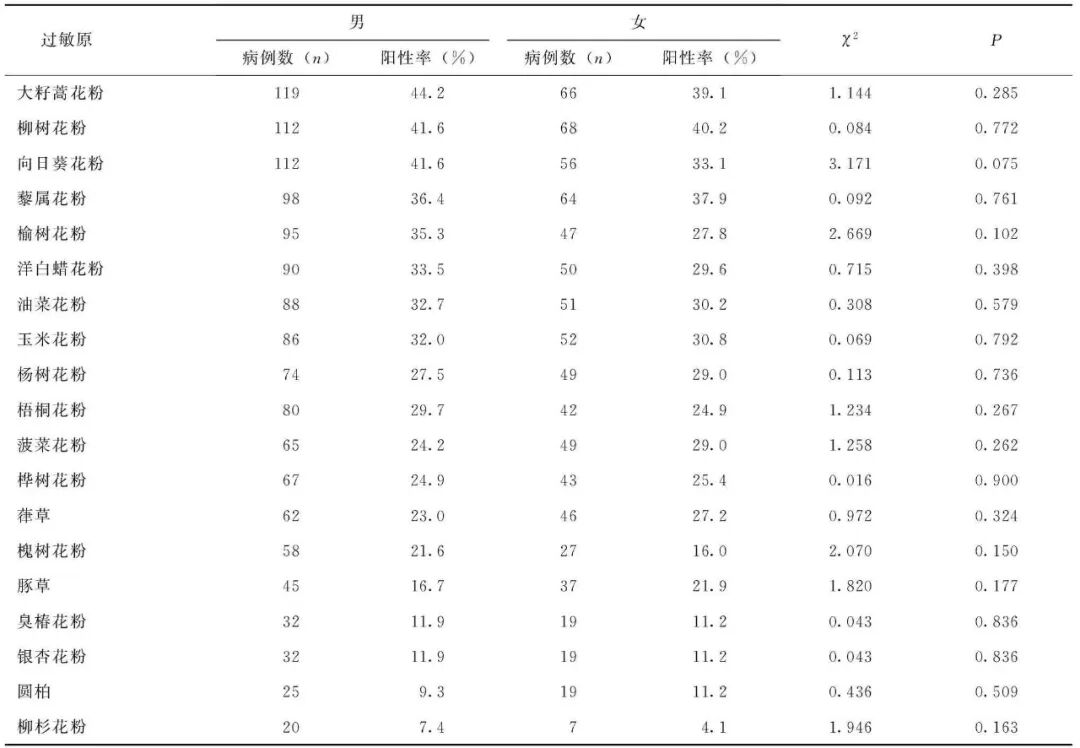 花粉作为常见的室外吸入性过敏原,其性质和数量随植被、地理、温度和气候的不同而变化,不同地区花粉种类的敏感程度也有差别。兰州地区属于大陆性很强的温带季风气候,植被种类多样复杂,四季分明,春秋两季是花粉过敏的高发季。通过对上述19种花粉过敏原统计分析,发现菊科、杨柳科、藜科等植物是兰州地区主要花粉过敏原。大籽蒿属菊科蒿属植物,其花粉阳性率最高,达到了42.2%,蒿属植物在兰州地区数量较多、分布广,其花粉数量多、体积小、质轻,易于飘散,具有较强的致敏能力,这与既往的研究结果[6-8]相一致。柳树属杨柳科柳属植物,其花粉阳性率同样较高,达到了41.1%,在兰州地区,每年四五月份是柳絮漫天飞舞的季节,过敏性疾病的发生较多,目前正逐渐改善园艺种植结构等方式,减少柳树的数量,进而降低柳絮对人们造成的困扰,但这一跨度时间较长,可能需要几十年的更迭。向日葵属菊科向日葵属植物,其花粉阳性率达到38.4%,这可能与兰州地区近年来农作物种植规划有关,向日葵的种植量较前明显增加,向日葵花粉虽然是虫媒花粉,花粉粒较大,不易播散,但其具有较强的致敏性。藜属植物在兰州地区种类数量较多,因而阳性率也不低,达到37.0%。臭椿花粉、银杏花粉、圆柏、柳杉花粉的阳性率在6%~12%之间,榆树花粉、洋白蜡花粉、油菜花粉、玉米花粉、杨树花粉、梧桐花粉、菠菜花粉、桦树花粉、葎草、槐树花粉、豚草的阳性率均在20%~30%左右。建议有花粉过敏的哮喘患儿在过敏季节居住到花粉浓度相对低的地区,同时出门需佩戴口罩,一旦出现花粉过敏需自觉回避过敏原,及时医院就诊,减少哮喘急性发作的风险。