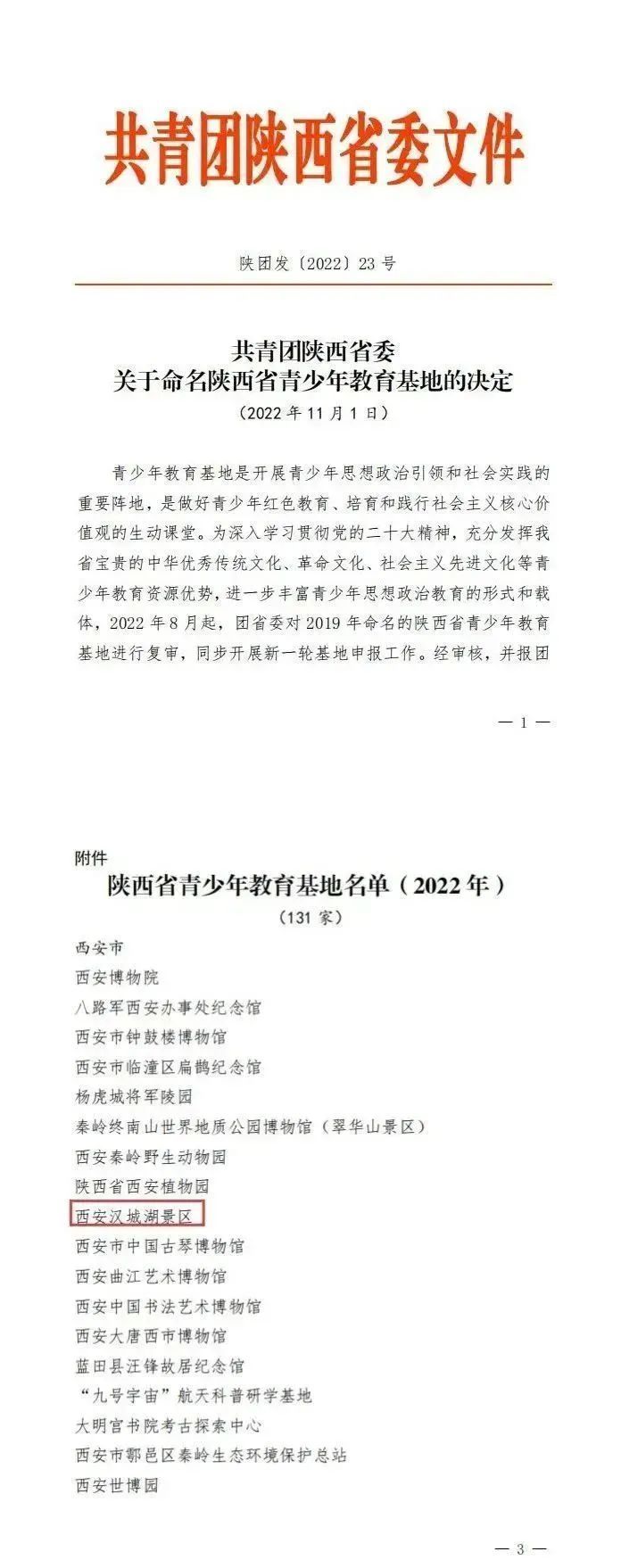 共青团陕西省委公布了2022年陕西省青少年教育基地名单,全省131家单位上榜,其中,西安汉城湖景区凭借着丰富的科普资源、多样的教学活动顺利通过复审。