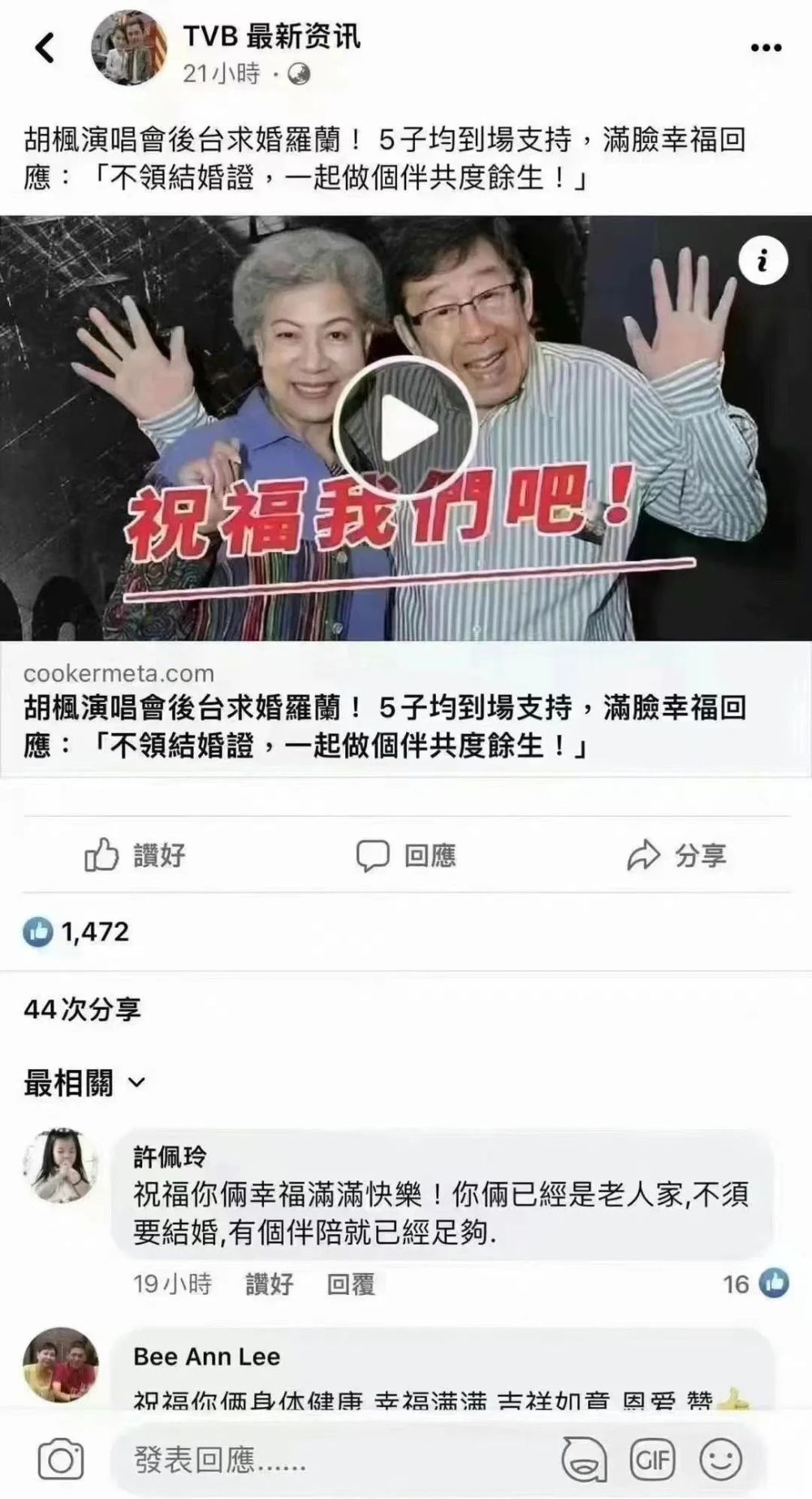 演唱会结束后呢,就有一个叫“TVB最新资讯”的账号在facebook发了这么一则消息,说胡枫演唱会后台求婚罗兰,还言之凿凿了很多细节,比如五个子女都到场,胡枫表示“不领结婚证,一起做个伴”之类……下面也有网友的恭喜留言。
