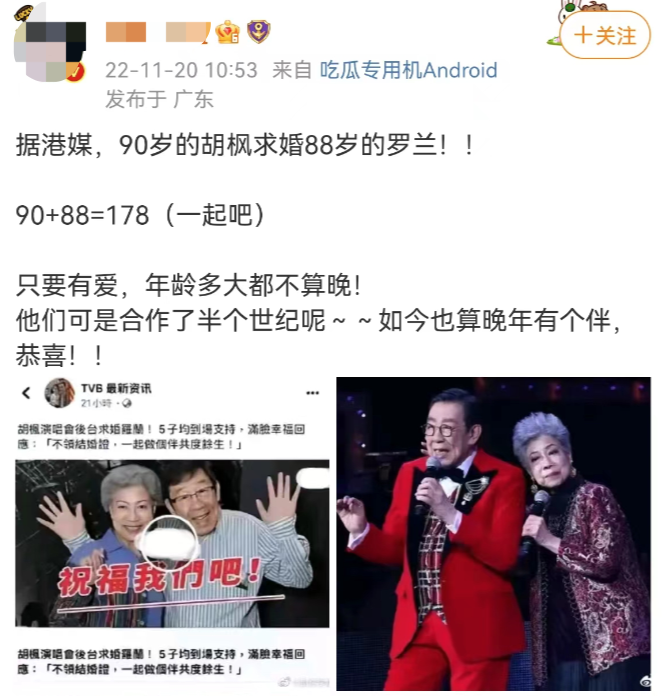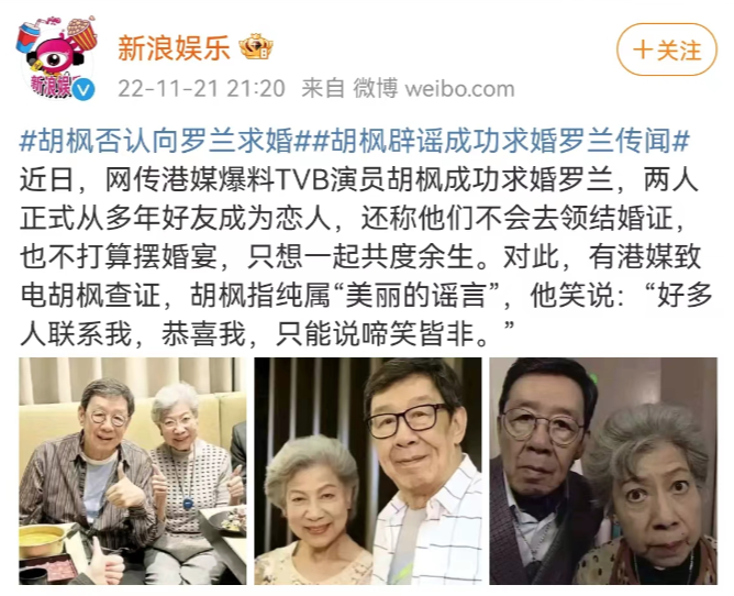 11月,有个假新闻搞得还挺沸沸扬扬的,就是香港老牌艺人胡枫求婚了罗兰的事。