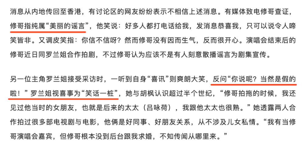 果不其然,几天之后,胡枫和罗兰亲自辟谣了,说这是个“美丽的谣言”: