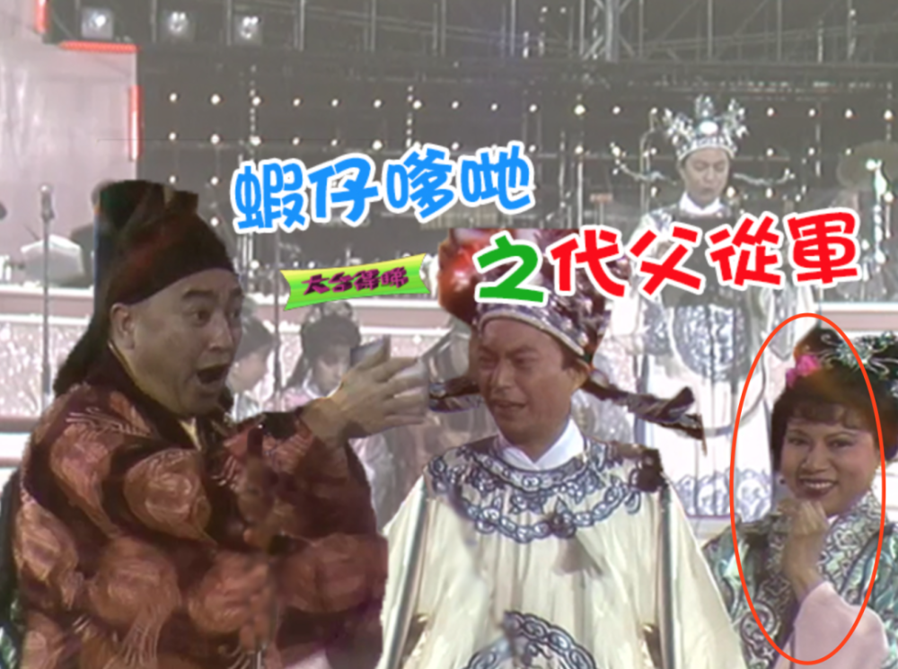▲《虾仔爹哋》也是欢乐今宵的皇牌肥皂剧,每集卢海鹏出场时都会唸一首无厘头的对联如“一日一个生蕃茄,男人都变小姐”,惹来哄堂大笑。左起罗兰,林建明,卢海鹏。