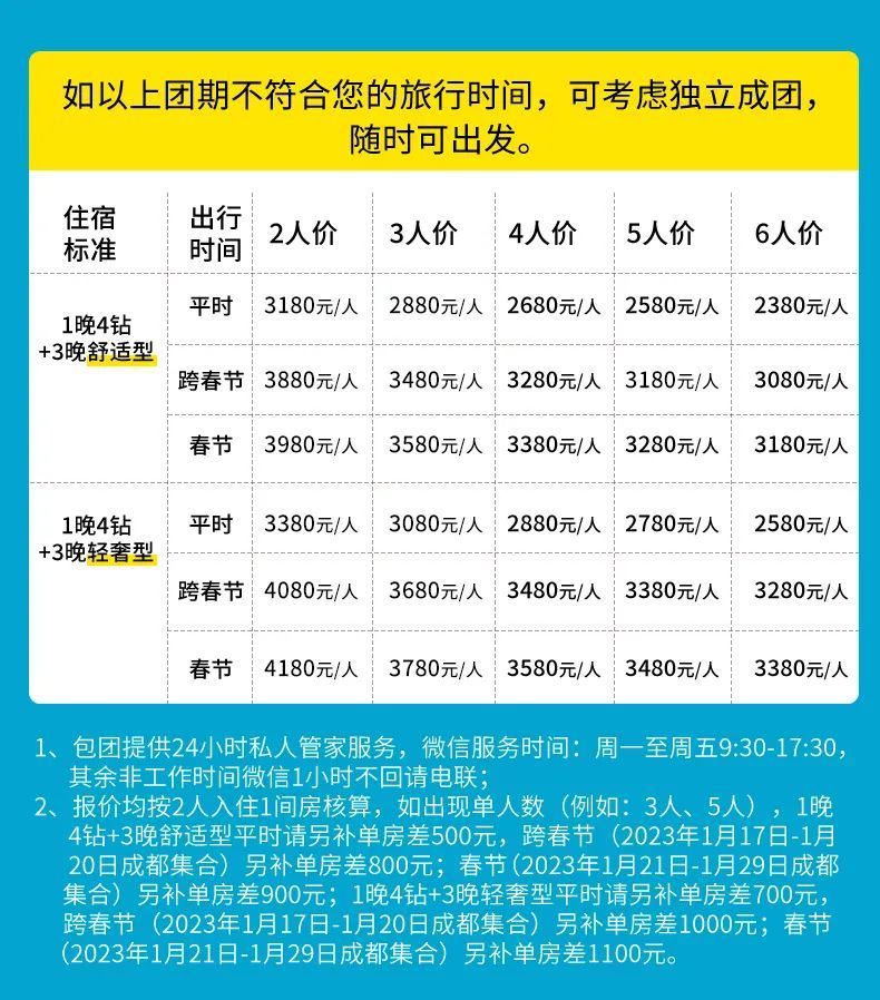 (3)春节及跨春节:出团日期当中如有春节日期的团队,无论何时何地何种方式退团,所有费用不退。