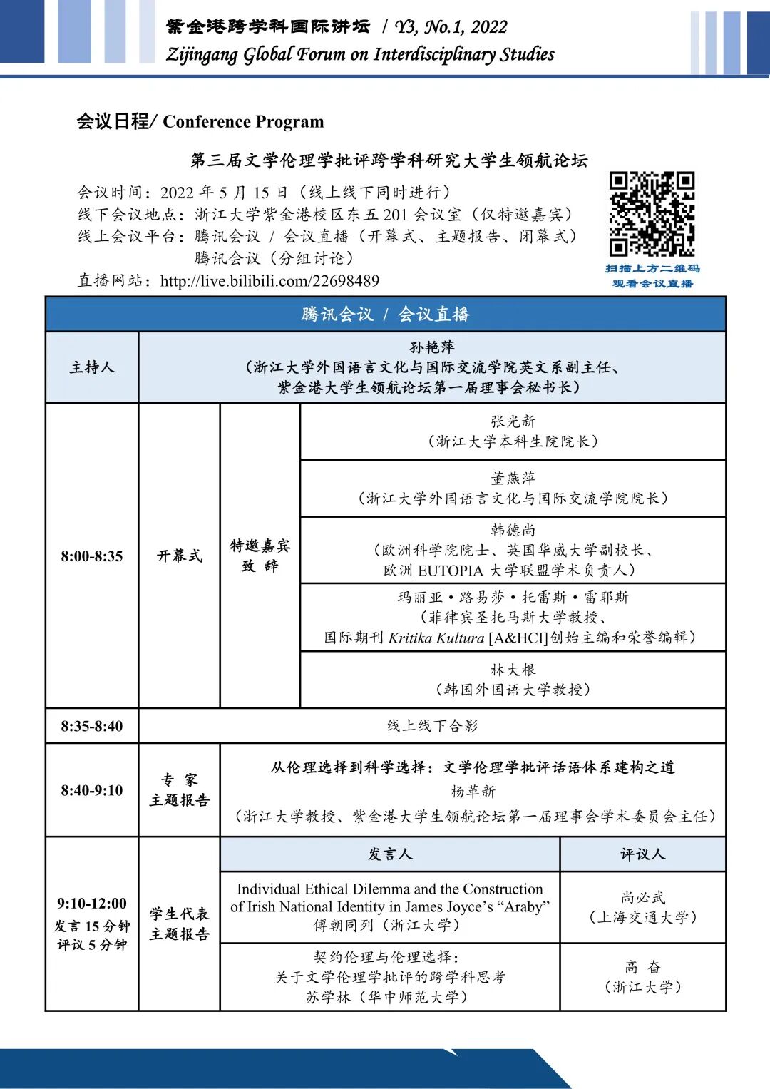 为了推动一流本科课程建设及高质量教学研究,浙江大学世界文学跨学科研究中心、浙江大学本科生院教务处通识教育中心、浙江大学外国语言文化与国际交流学院英文系联合英国华威大学、韩国建国大学、韩国外国语大学、菲律宾圣托马斯大学于2022年5月15日共同举办“第三届文学伦理学批评跨学科研究大学生领航论坛”。