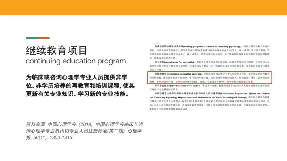 继续教育项目(continuing education program):为临床或咨询心理学专业人员提供非学位、非学历培养的再教育 和培训课程, 使其更新有关专业知识、学习新的专业技能。
