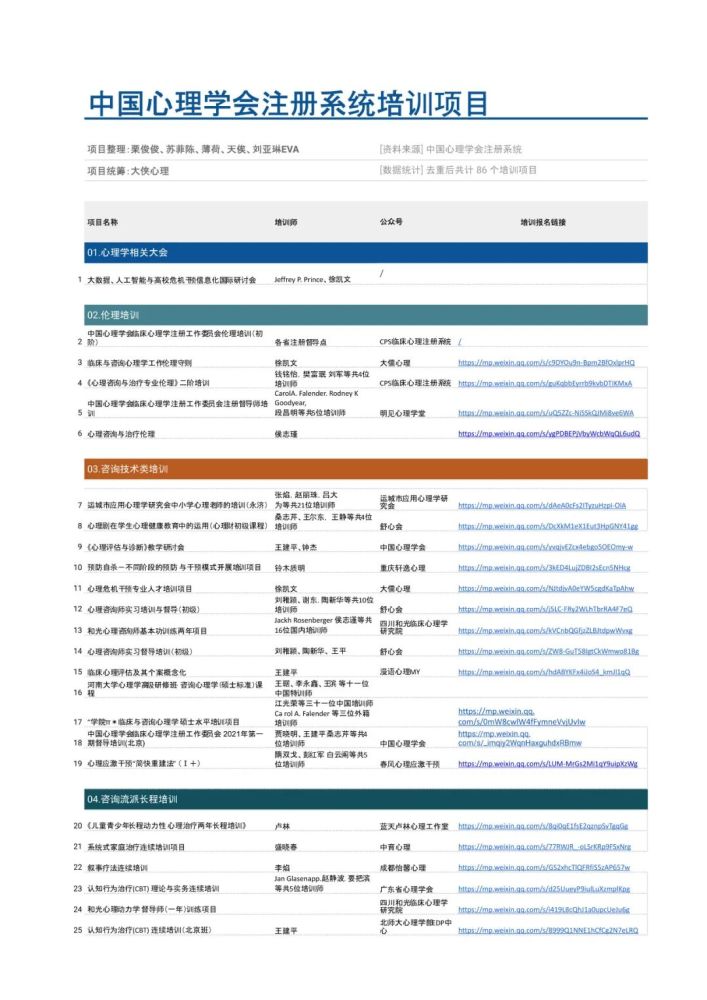 我找了几位小伙伴花了一天时间,把中国心理学会最近 4 年里认可的 146 项培训整理出来了,经过去重后,还有 86 个培训内容,这些培训你可以在这里看到,有课程的报名链接,发布培训信息的公众号、网站、机构等等。