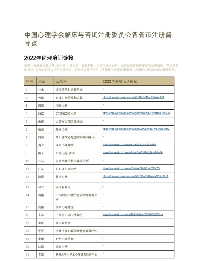 我帮你整理好了,这些公众号都是中国心理学会在各省的注册督导点,这些督导点会发布每年会发布消息自己会在什么时候有伦理培训。