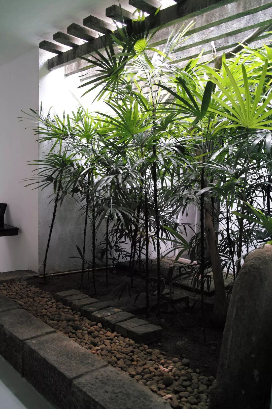 巴瓦的科伦坡33街自宅并无一般意义上的“核心空间”,但并不匀质。面对基地上原有颇为简陋的传统坡屋顶住宅,巴瓦并未采用现代建筑的常规做法:拆或不拆,都引入一个全新的、与环境彻底脱开的语言体系,造一个“世界中的世界”;他是随物赋形,将连续屋面下的四栋房屋顺势接纳,内部空间稍作调整,用最小的人力成本和投资预算得到一个内向的“园宅”。重要的改变除了核心交通空间,就数若干似连似断的庭院了。与庄园不同,自宅的建筑覆盖率高得多,庭院是作为建筑的“零余”而存在的,但它们却在各个环节成为感知的核心。巴瓦将不同尺寸的庭院插入不同位置,为空间赋予灵性。入口白色门廊中两处“袖珍”庭院故意高于地坪,像“盆景”般带来自然意态,功能上则提供采光和隐蔽的视线(其中一处可从巴瓦的卧榻瞥见);核心起居空间的庭院在相对昏暗的室内环境中成为绝对的视觉焦点,也是室内的自然延伸,模糊了内外关系,并引出通往服务区域的路径。在较小的尺寸上,自然浓缩成一株紫藤、一片天空,变成具有空间和功能作用的“盆景”,而与建筑空间等价。在这里,原始的基地条件成为“地形”,巴瓦的做法类似于街头巷尾的自发性建造,以极轻便的动作完成任务。
