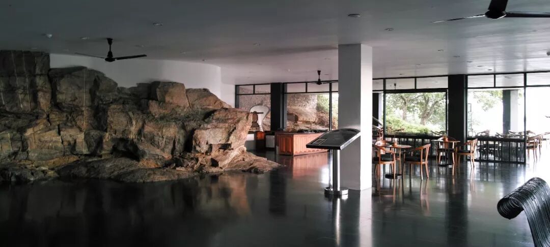 《巴瓦全集》的作者称这种做法为习惯性的“旧物拼贴”,其实天底下并无“新”物,一切都是本来存在的,所以巴瓦拼贴的对象何止旧物。似乎一切现实物品与抽象观念都能无区别地拼贴在一起,融化在他的建筑世界里,无论自然人工、东方西方、古代现代、新的旧的、死的活的、有用无用,彼此不相冲犯。自宅门口的月亮石、伊娜·迪·席尔瓦住宅(House for Osmund and Ena de Silvar, 1960-1962)檐下的古代石柱、灯塔酒店(Lighthouse Hotel,1995-1997)中庭的天然石头块和圆楼梯的巨型战斗雕塑、本托塔海滨酒店(Bentota Beach Hotel, 1967-1969)水庭下方的城堡遗址和入口天花上俯瞰众生的金属章鱼(太阳神)雕像……在坎达拉玛,甚至巨大的山岩、裸露的壁面、虬曲的古木和满山的猴子都成为建筑鲜活现场感的拼贴物;建筑简化到只剩框架,而后化身为巨大的取景器,将山岚、雾霭、晨昏朝夕、古代的人工湖和岛国最富盛名的遗迹——狮子岩拥入怀中。巴瓦真是把这个活生生的世界拼贴到极致。