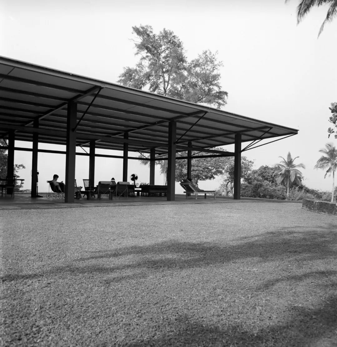最终,在整体上,巴瓦对密斯(Mies van de Rohe)的匀质空间(Universal Space)情有独钟。当路易·康在1960年代抛弃了均匀柱网并重返单元聚合之时,巴瓦让匀质空间融入乡土。必须将巴瓦的努力看作自觉的知识建构,似乎稍微不同于其他素材无差别的自由拼贴。在巴瓦并不太突出的个人设计语言中(这也恰好印证了赖特所谓“大自然没有风格”的判断),连续框架梁柱体系一直牢牢占据核心位置。巴瓦可以说是一位只用框架体系就造出无穷变化的建筑师,或者缘于他专业知识的匮乏,或者是“适可而止”的建造态度使然。如果说早年的席尔瓦医生住宅(A.S.H.de Silva House, 1959-60)只是对密斯“砖宅”平面构成的简单模仿,巴瓦晚年语言洗练克制,随意的动作越来越少,跟密斯一样,仿佛是在试探修辞学的底线。无论是碧水酒店(Blue Water Hotel, 1996-1998)的门廊还是坎达拉玛的立面,似乎都是简化、平实化了的密斯,朴实无华,大开大阖。到赤壁之家(Pardeep Jayewardene House, 1997-1998),所有装饰和巧思都已荡涤一空,巨大且略倾斜的钢结构水平屋面笼盖之下,三组室外家具散漫地占据着规整网格下的自由空间,组成巴瓦钟爱的棋盘格,巴洛克和密斯无声地融为一体。巴瓦仿佛是在用建筑告诉我们:世界如此丰盛,唯简单建筑才能安放。