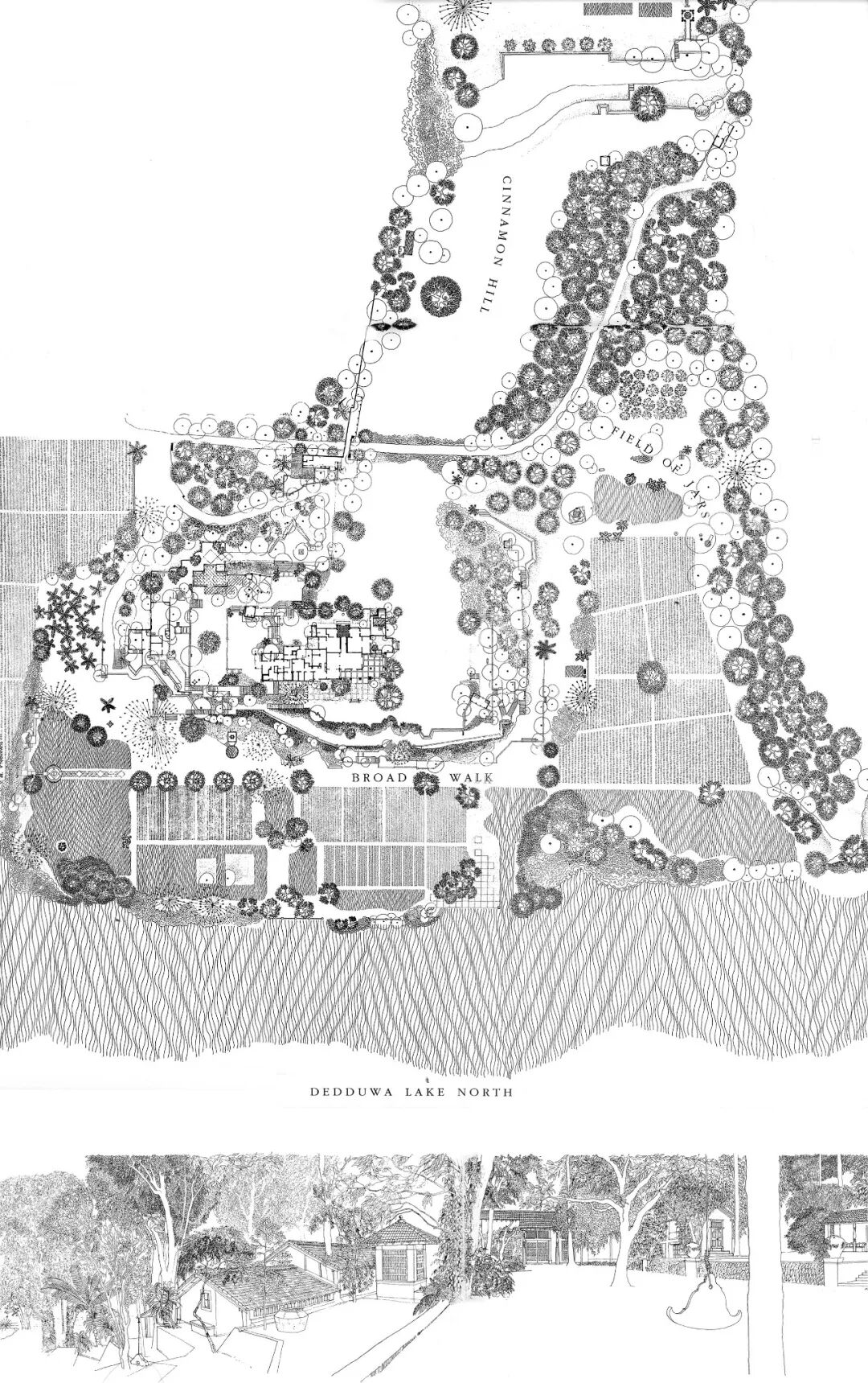 巴瓦的设计生涯起于花园而终于花园,他有限的书本知识不足以应对精密的制图,此事尽人皆知。人们却不一定能想象,一生中有多少个周末,巴瓦在卢努甘卡花园(Lunuganga, 1948-1998)中仔细观察、反复斟酌,耐心等待植物长到理想中的高度。中部丘陵道路尽端的角落里散布着一些座椅,面向远方,是巴瓦晚年行动不便时指挥家仆修整花园的落脚点。周末像一些散落的时间碎片,将花园从大地中琢磨出来,表面上天然生动,其实草木间无不是精心打理的痕迹。作为人工环境,卢努甘卡花园将地形、建筑、植物、器物不加区分地编织在内,又精心融入远山湖泊,使用最接近于自然的设计语言,将天地纳入建筑。