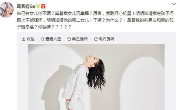 章子怡婚后与汪峰、小苹果拍照一起过情人节,照片里三个看起来非常媳妇,葛荟婕看到后非常生气,对章子怡说:“你有女儿,为什么要拍我的女儿,你是缺什么吗?”