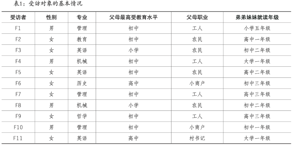 [10]田杰,余秀兰.从赤字视角到优势视角:第一代大学生研究述评[J/OL].重庆高教研究:1-16(2021-02-07)[2021-02-10].http://kns.cnki.net/kcms/detail/50.1028.G4.20210207.0853.002.html.[11] Gofen A. Family capital:How first‐generation higher education students break the intergenerational cycle[J]. Family Relations,2009,58(1):104-120.[12]Tinto V.Leaving college:Rethinking the causes and cures of student attrition[M].University of Chicago Press,1987.[13]谢爱磊.精英高校中的农村籍学生—社会流动与生存心态的转变[J].教育研究,2016,37(11):74-81.[14] Benmayor R. Narrating cultural citizenship:Oral histories of first-generation college students of Mexican origin[J]. Social Justice,2002(4):96-121.[16]刘远杰.后脱贫时代的教育扶贫行动—对教育扶贫过程与结果的教育哲学思考[J].教育发展研究,2020,40(1):27-35.[17] Sherman A M,Lansford J E,Volling B L. Sibling relationships and best friendships in young adulthood:Warmth, conf lict,and well‐being[J]. Personal Relationships,2006,13(2):151-165.[18] Yeh H C,Lempers J D. Perceived sibling relationships and adolescent development[J]. Journal of Youth and Adolescence,2004,33(2):133-147.[19] Hurtado-Ortiz M T,Gauvain M. Postsecondary education among Mexican American youth:Contributions of parents,siblings,acculturation,and generational status[J].Hispanic Journal of Behavioral Sciences,2007,29(2):181-191.[20] Milevsky A,Levitt M J. Sibling support in early adolescence:Buffering and compensation across relationships[J]. European Journal of Developmental Psychology,2005,2(3):299-320[21] Loury L D. Siblings and gender differences in African-American college attendance[J]. Economics of Education Review,2004,23(3):213-219.
