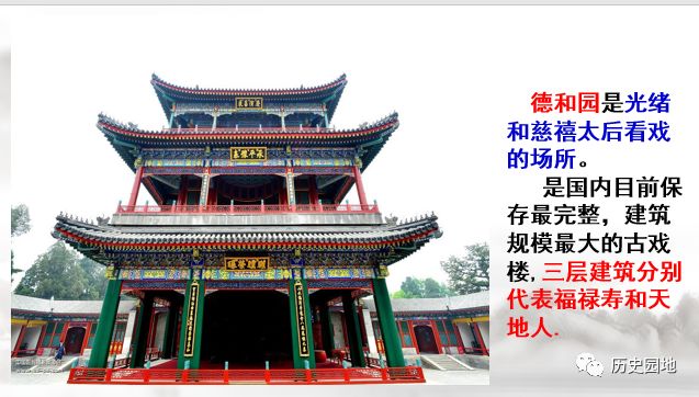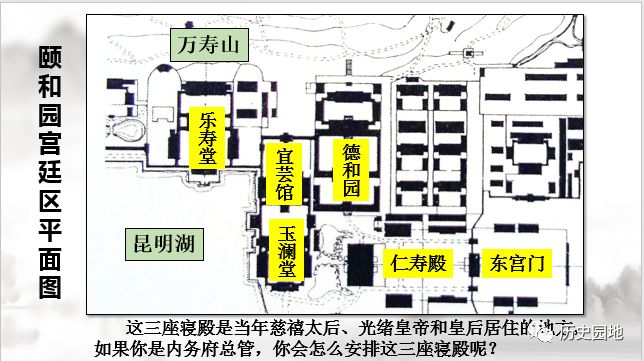 教师:这样的安排也形象地反映了当时慈禧、光绪和皇后在宫廷中的实际地位。既然慈禧地位最高,那么一些建筑的兴建自然也就和她有关,