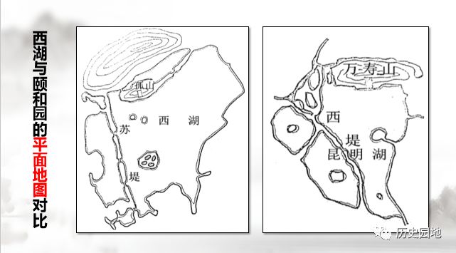 学生:山北水南的结构:西湖孤山在北,西湖在南,湖面西部有苏堤;颐和园万寿山在北,昆明湖在南,湖面西部有西堤。