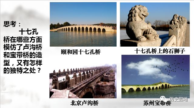 教师:十七孔桥的造型借鉴了北京卢沟桥和苏州宝带桥的样式。(展示图片)从图中可以看出,十七孔桥在哪些方面模仿北京卢沟桥和苏州宝带桥的造型,又有什么独到之处?