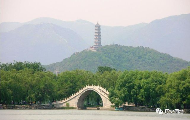 站在佛香阁上向西眺望,远处是连绵起伏的西山,近处是林木青葱的玉泉山及山上的玉峰塔。虽然这些都不是园林内部的景观,但却被纳入颐和园的画面之中,再加上西堤上遍植的柳树将园林西部的围墙遮挡了起来,巧妙地消除了园子的西部界限,使有限的园林显得无限深远,构成山外有山、景中有景的幽美意境。这种造园手法被称作“借景”。