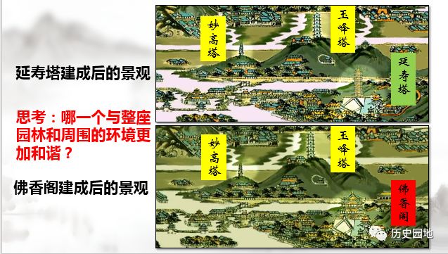 教师:这是延寿塔和佛香阁建成后的模拟景观对比图,你认为哪一个与整座园林和周围环境更加和谐?