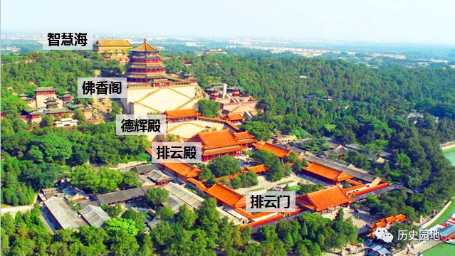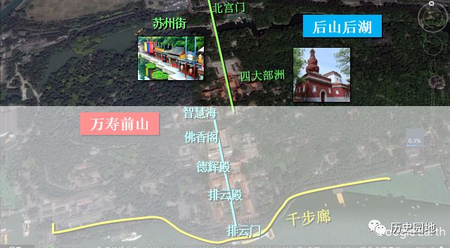 教师:俯瞰万寿山,你会发现后山也有一条中轴线从四大部洲到北宫门,这与前山的中轴线遥相呼应,很好地协调了前山与后山的关系。