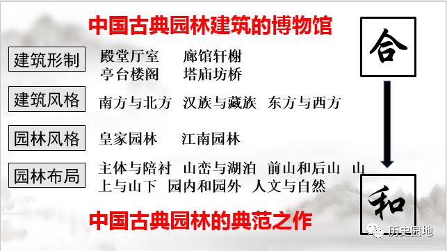 教师:很好。和而不同,由合到和的理念,不仅体现在这些建筑之间,还完美地体现在人造建筑与自然山水之间。(人文与自然)所以世界遗产委员会对颐和园给出了这样的评价: