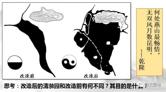 教师:很好,如果从整体上看,改造前的山峦与湖泊是相对孤立的,而改造后则是水中有山、山中有水、水乳交融。如果把陆地看成阳、水面看成阴的话,改造后的格局则很像太极图的一个变体。这也说明清漪园的改造过程遵循了我国古代的阴阳平衡思想。通过这一改造,山峦和湖泊的关系变得非常协调。(板书:山峦与湖泊)