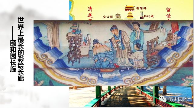 从乐寿堂出发往西走,有一条长达728米的长廊将前山景区的建筑群连接在了一起,成为万寿山前山景区的东西轴线。这条长廊也是世界上最长的长廊,但要走完它,无论对于乾隆的母亲还是后来的慈禧太后,都是太辛苦了。所以在设计这条长廊的时候,一方面在中间建造了四座亭子以便休息;另一方面在每一根枋梁上绘制了“苏式彩画”用以欣赏。这些彩绘大体可分为人物、山水、花鸟和建筑四大类,其中,最引人入胜的当属人物彩画故事。我选了几幅来给大家欣赏一下:(展示幻灯片:孔融让梨、岳母刺字)