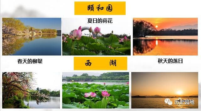 导入以西湖和颐和园的图片,让学生发现其中的相同点,进而引入第一部分。