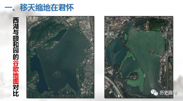 教师:不过,细心的同学可能会发现两者还是有很多不同,比如:万寿山的面积比孤山要大很多,苏堤是笔直的,而西堤则相对蜿蜒曲折一些。这说明,乾隆并不是照搬西湖的样子,而是对这里进行了重新的规划和设计。我们再对比一下改造前和改造后的清漪园,看一下有怎样的改变?