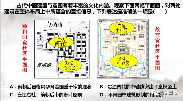 教师:不过,颐和园的居住区并不像故宫一样与政治活动区排列在一条中轴线上,而是依山傍水,注重与自然山水的融合。
